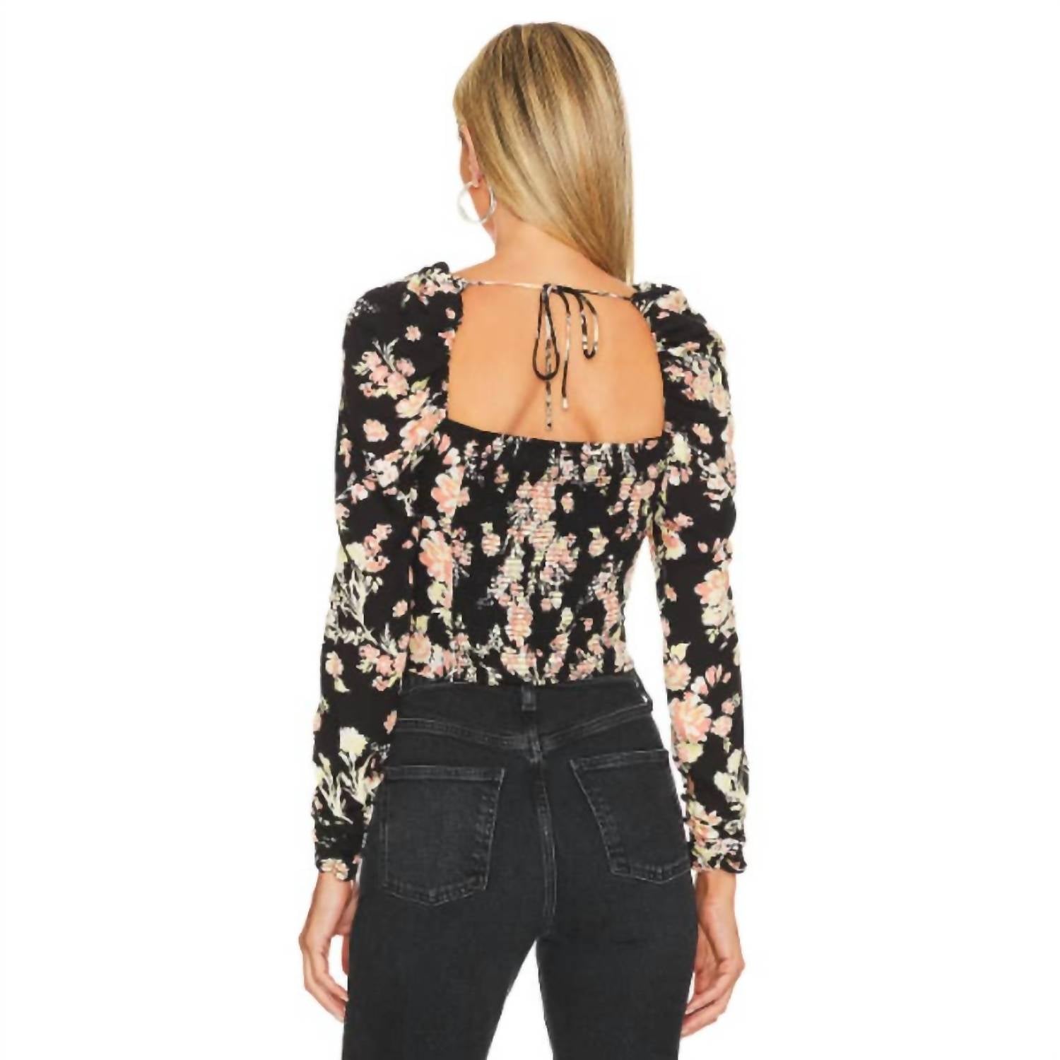 Enchanting vibrant floral pattern on a Black Combo canvas. Features a sophisticated square neckline and long sleeves. Offering an effortlessly chic look. Enjoy convenience with its tie closure, perfect for quick styling.