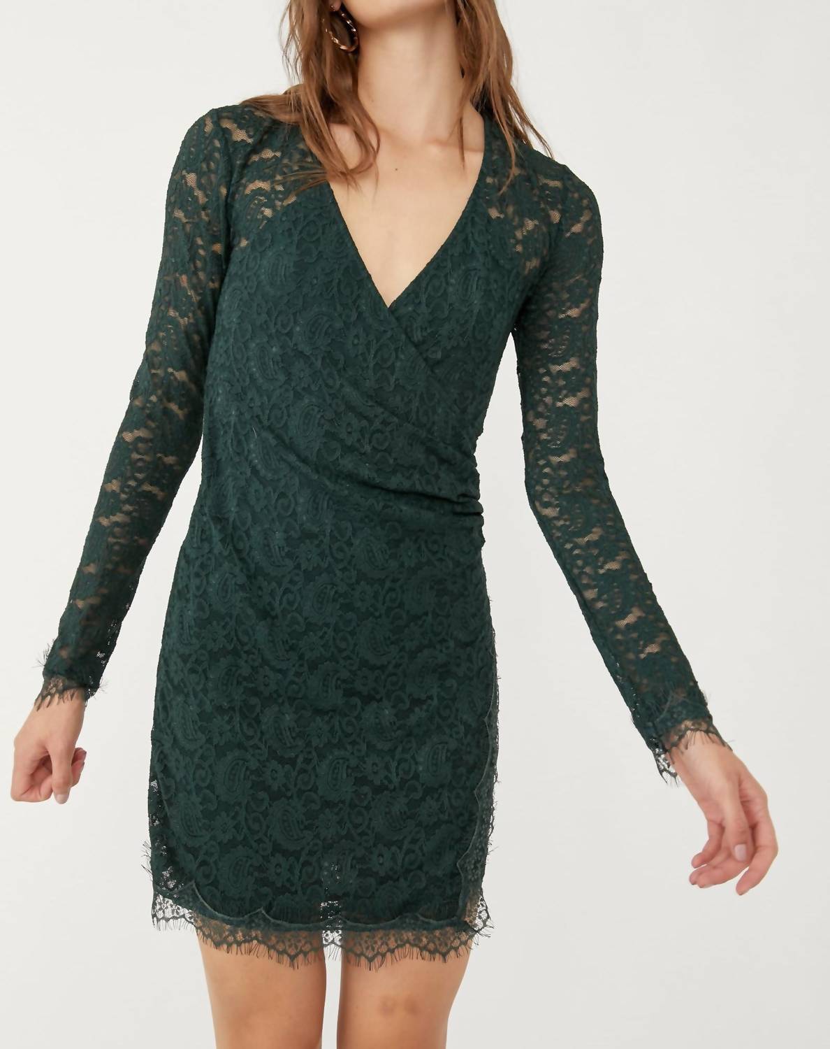 95% polyamide, 5% elastane. Lining: 100% viscose. Pull-on styling with a V-neckline. Long sleeve design with scalloped edging. Ruching detail at the side. Body-hugging silhouette. Above-the-knee scalloped hemline. Hand wash cold. Imported. Product measurements were taken using size SM (Women's 4-6). Please note that measurements may vary by size. Measurements [Length: 34 in, Chest Measurement: 14 1⁄4 in, Sleeve Length: 25 in]