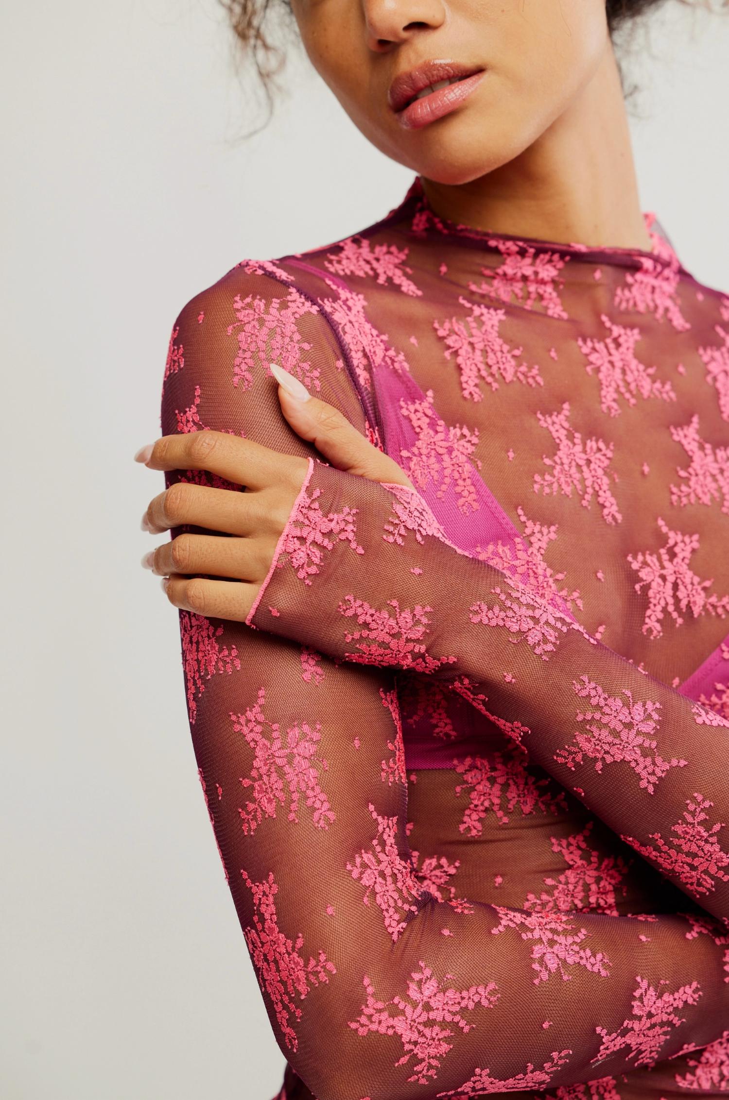 The Free People Two Tone Lady Lux Layering Top is a must-have for any wardrobe, perfect for adding an extra touch of style. This garment boasts long sleeves in a sultry mesh nylon blend with a two-tone sheer design and floral embroidery. It features a mockneck, thumbhole details, and a fluttery hemline with a pull-on closure. Designed in a relaxed fit, this top is perfect for layering in summer with its breathable, unlined, and sheer construction.