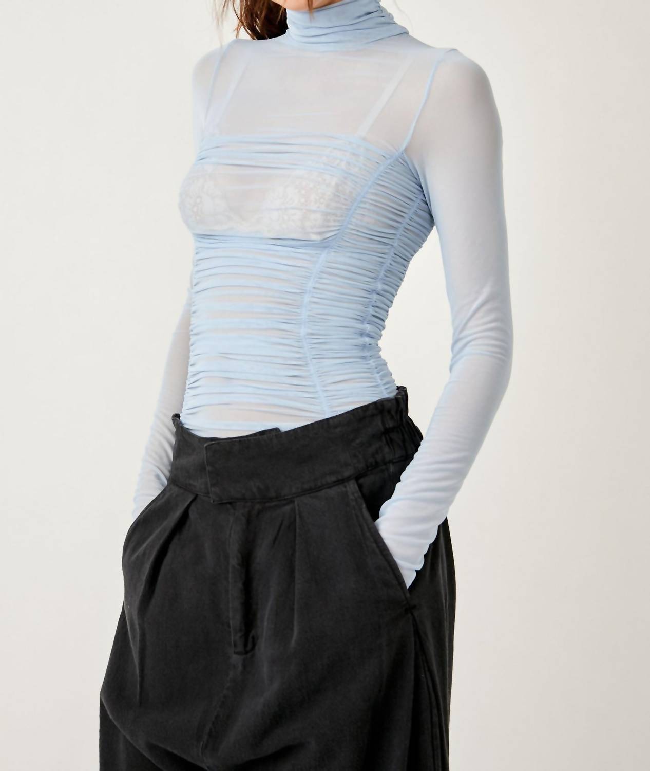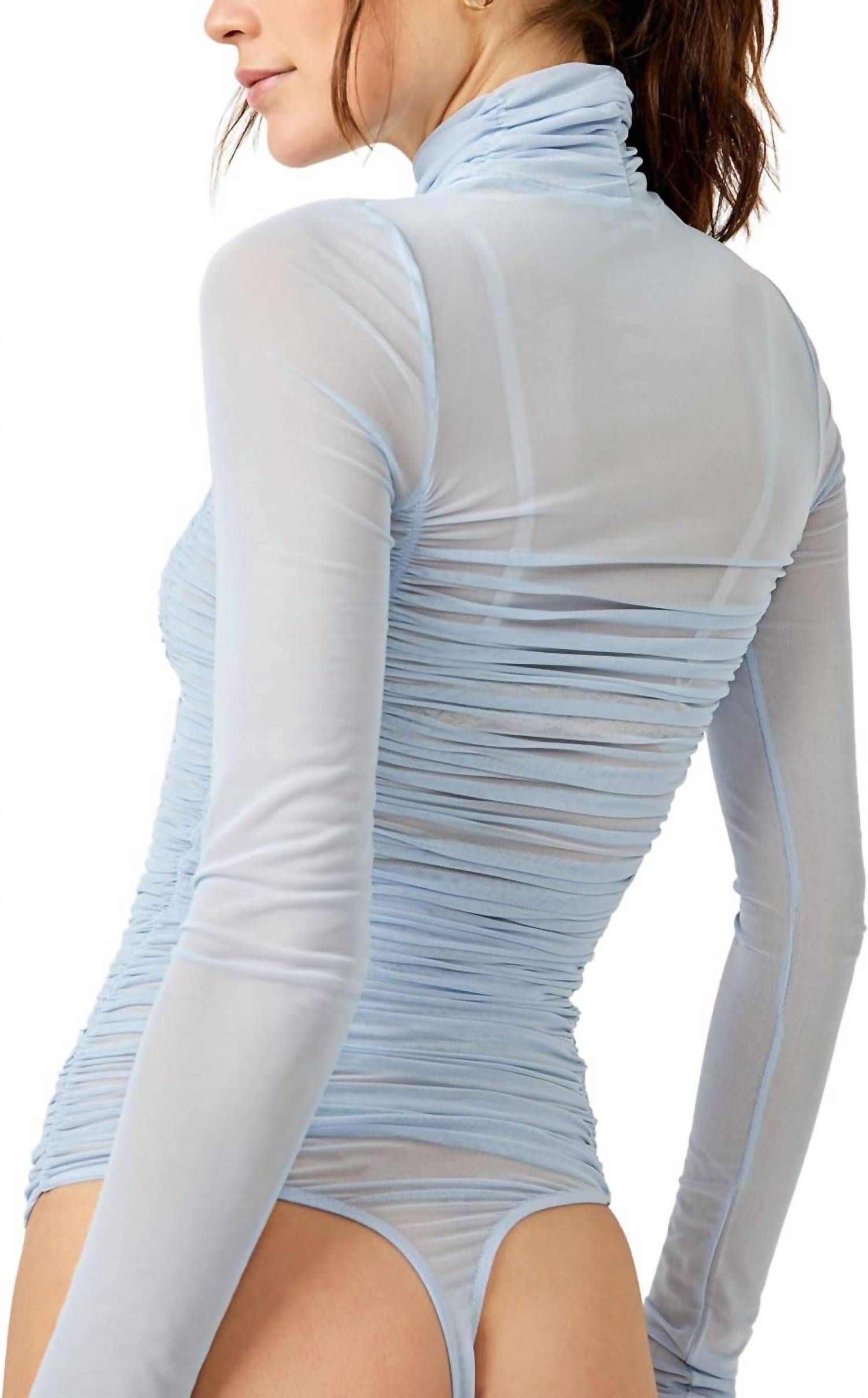 This stunning bodysuit is featured in a sheer mesh fabrication with gathered detailing at the bodice and turtleneck silhouette. Turtleneck. Long sleeves. Stretch fit. Slim design. Thong bottom coverage. 92% polyester, 8% spandex.