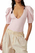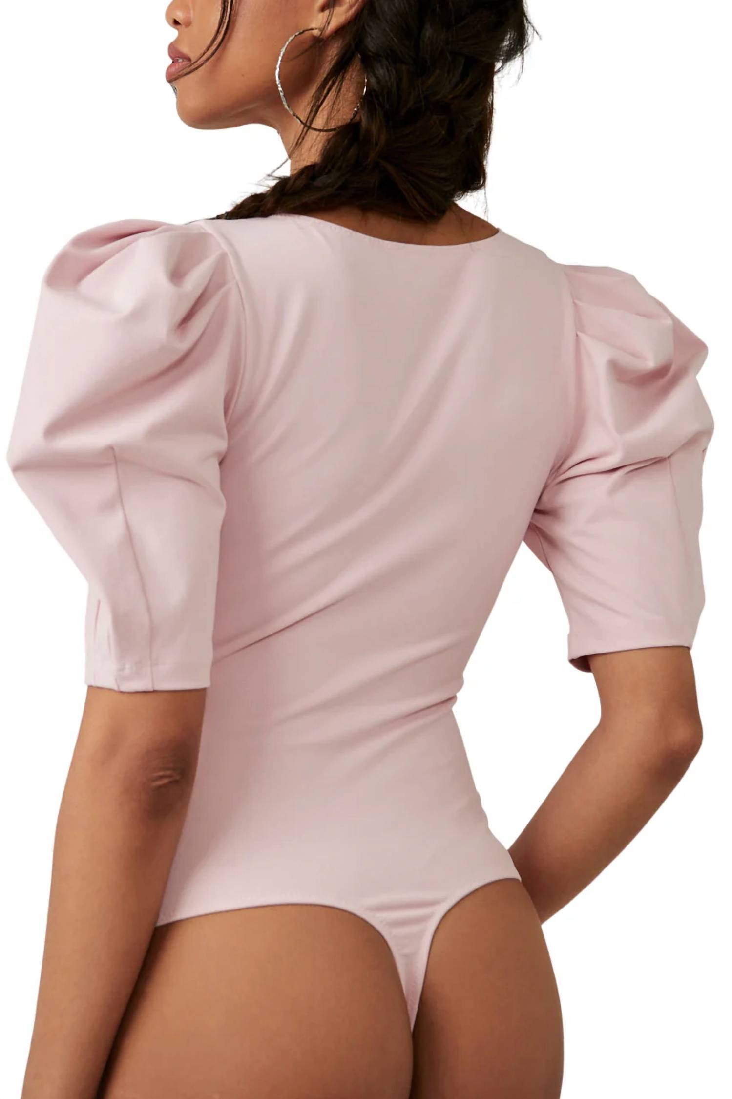 Delicate soft pink formfitting piece. Features short statement puff sleeves with pleated details and a deep V-neckline, enhancing your silhouette. With a snap closure and high-cut thong bottom. Offers both style and comfort. Crafted from 88% nylon and 12% spandex. Designed to support wear with or without a bra. Hand wash cold inside out, use non-chlorine bleach if needed, line dry, and cool iron on reverse side if needed.