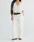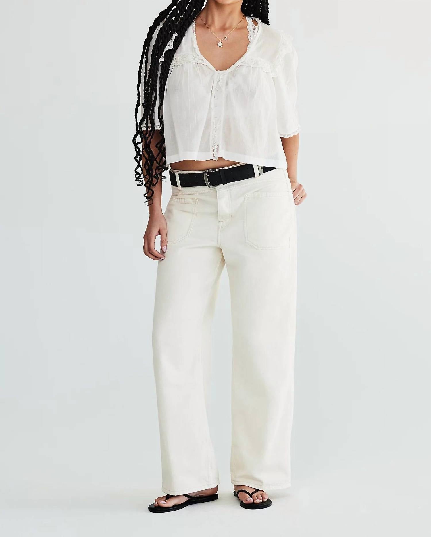 Introducing the We The Free Palmer Cuffed Jeans by Free People, a must-have for your denim collection in a chic eggshell shade. Designed with a mid-rise and relaxed wide-leg silhouette, these jeans feature a zip fly and button closure, seamed pouch pockets, and cuffed hemlines for added style. With a focus on comfort and versatility, these cotton jeans are perfect for pairing with sleek boots or sporty sneakers, making them ideal for any occasion from spring brunches to Thanksgiving gatherings. Measurements for size 28 are 32.5" waist, 41.5" hips, 12.625" rise, and a 26.5" inseam, and they are conveniently machine washable.