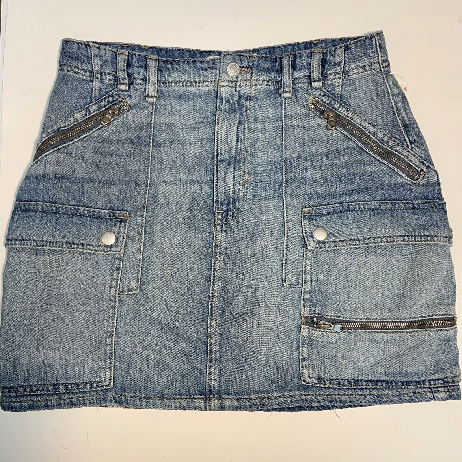 Free People | new with tags | blue denim jean skirt. Super cute skirt features angled zippers on the front along with snap flap pockets . Back has snap flap pockets also. Size 31 Measures Approximately 31” x 16” from the top to bottom