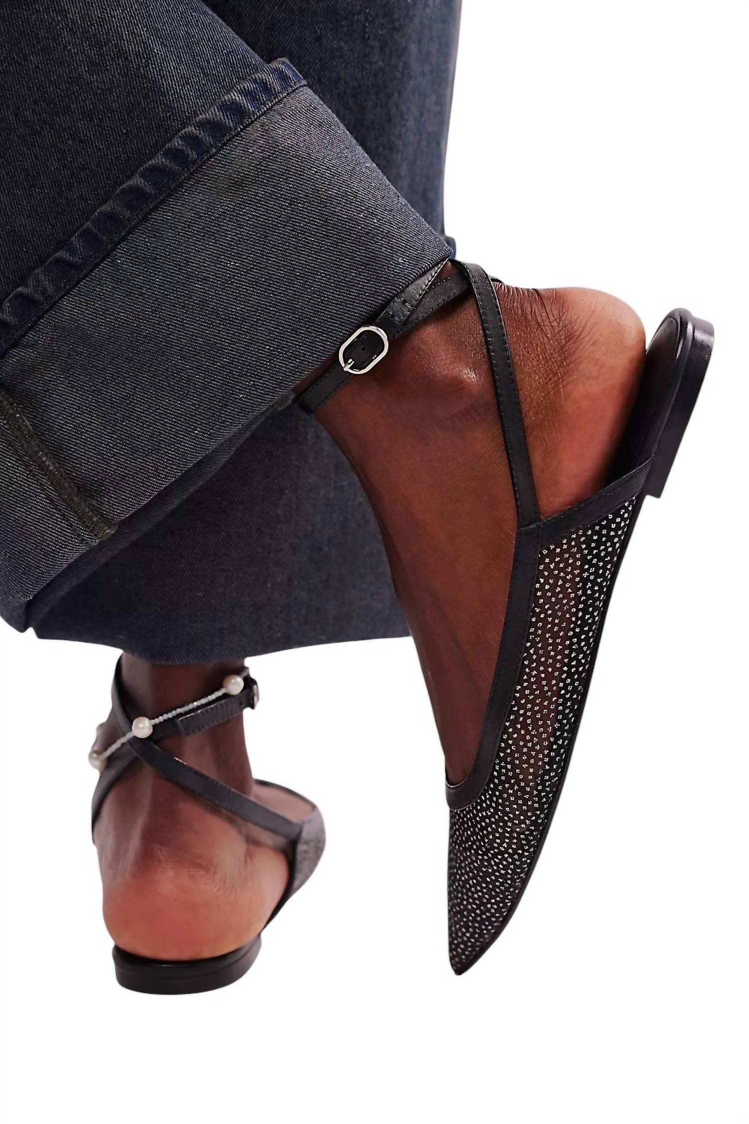 These ballet flats feature glittering sheer mesh with a solid pointed toe and an adjustable buckle ankle strap. They have a flat sole. Imported.