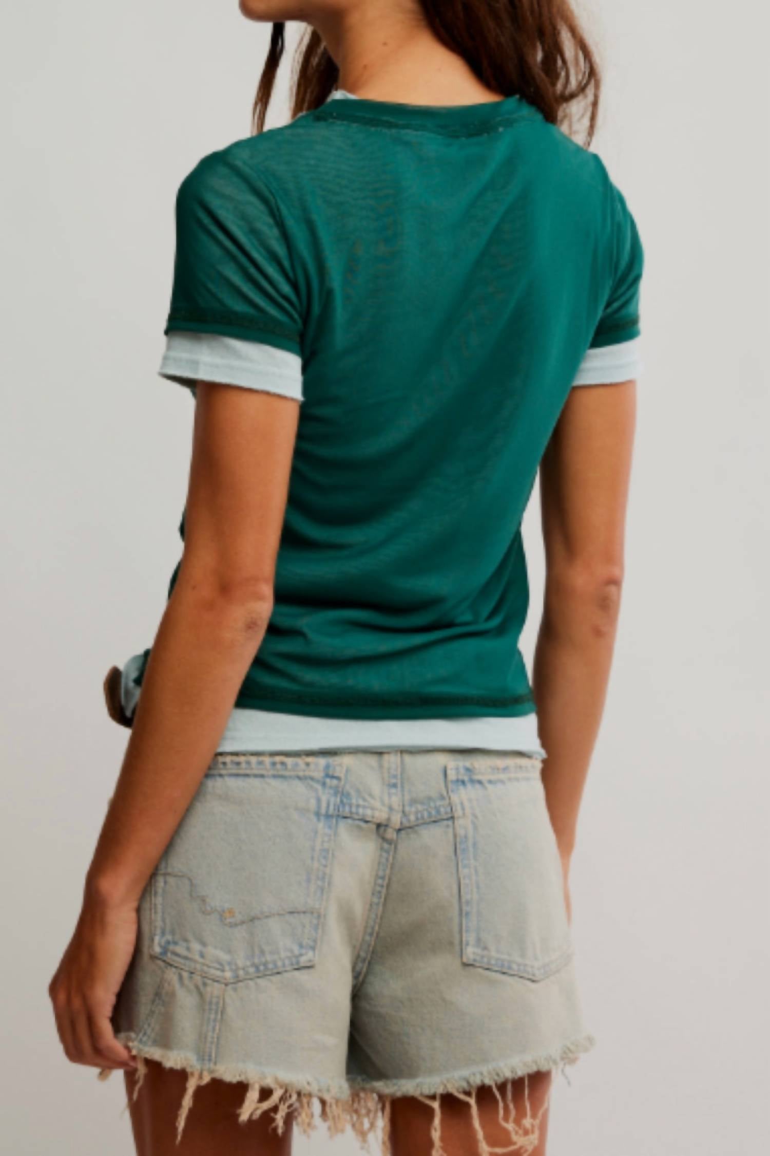 Discover the Women's Tasha Tee by Free People in the captivating Icy Lake Combo color, merging comfort with style. This short sleeve tee features a shrunken fit and twofer design, highlighted by a delicate nylon and elastane mesh overlay over a cotton base for easy layering. Composition: 95% Nylon, 5% Elastane; Lining: 100% Cotton. Closure: Pull on. Care: Machine wash cold, line dry.