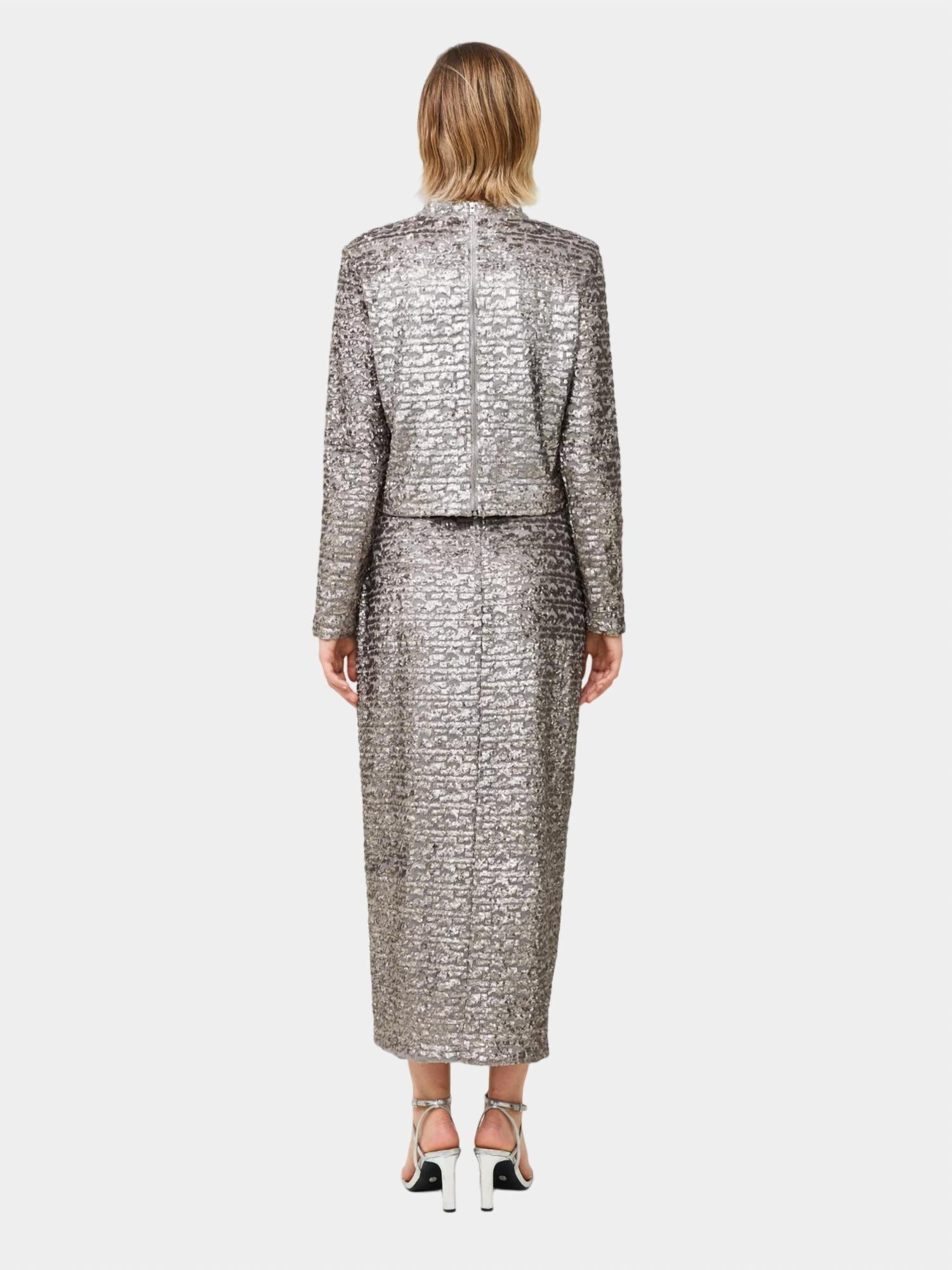 A-line silhouette. Sequin embellishment, shiny, and silver. Back zip closure. Side slit. Midi length. Mid-rise. Lined. 100% polyester.