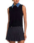 Introducing the Ellie Knit Collared Vest by French Connection, a chic addition to your holiday party wardrobe in classic black. This sleeveless vest features a contrast collar and ribbed detailing at the armholes and hem, tailored for a relaxed fit. Crafted from a blend of 47% polyester, 35% acrylic, 15% nylon, and 3% spandex, it combines comfort with style. Closure: Pullover style. Care: Machine wash. The model is 5'10" with a 33" bust, 25" waist, and 35" hips, and is wearing a size small.