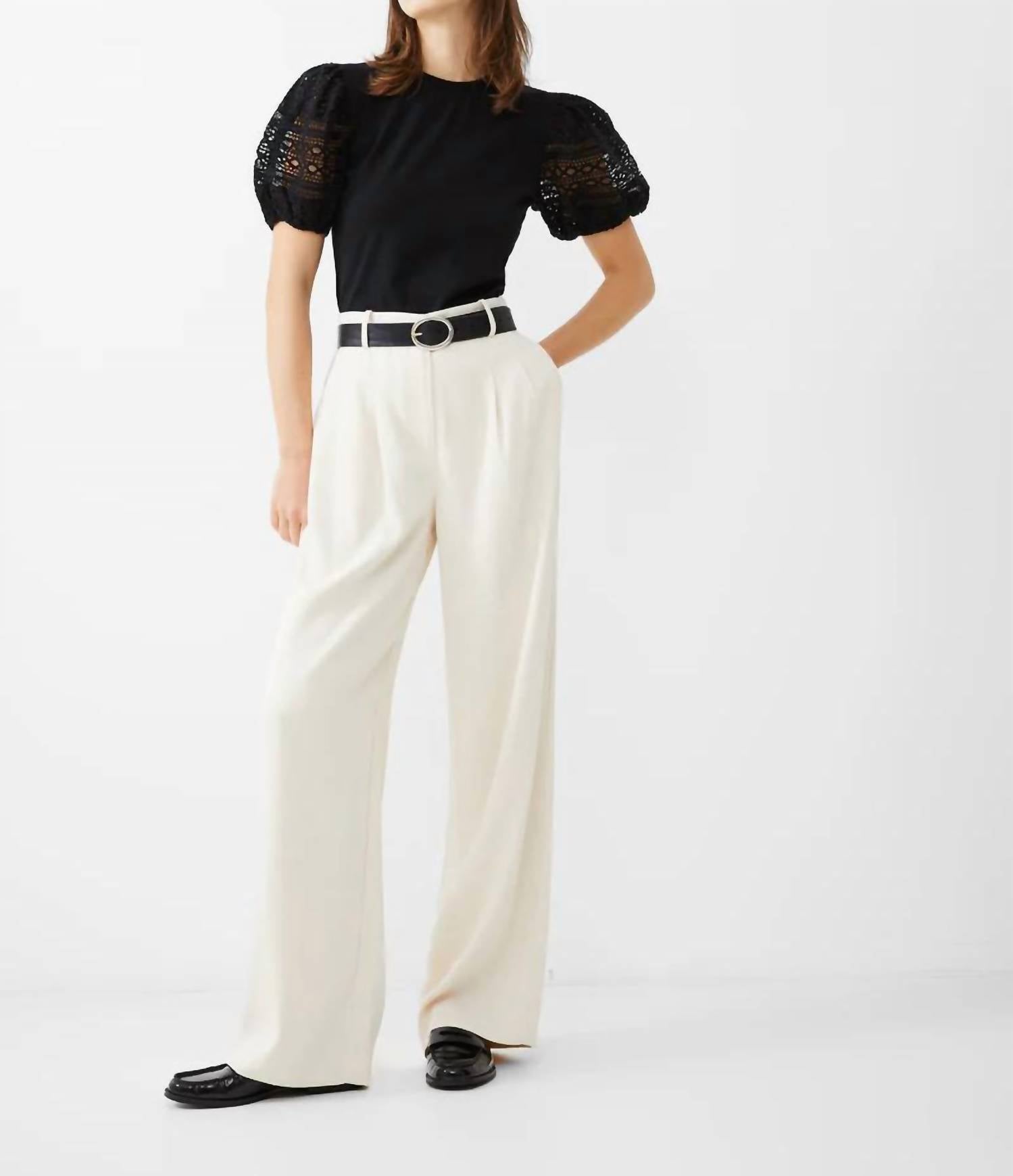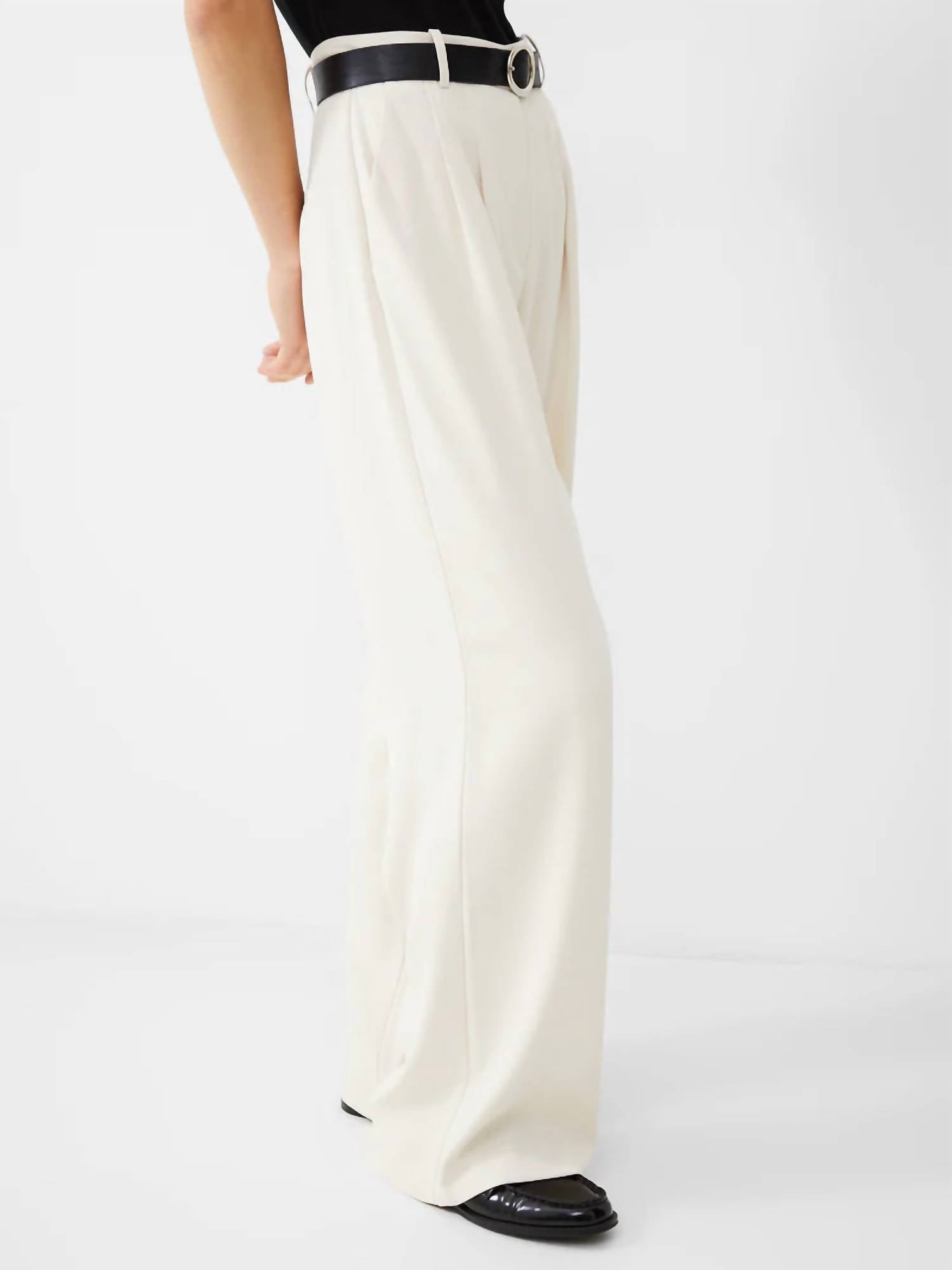 Introducing the Harrie Suiting Trousers by French Connection, a perfect blend of classic tailoring and modern flair. These trousers are designed with a wide leg silhouette and a high-rise fit, offering a relaxed yet sophisticated look. Crafted from 100% polyester, they feature a precise hook and eye closure and a zip fly with sewn-in waistband and belt loops for practicality. Imported with an inseam of 32.5 inches and a 13-inch rise, these trousers are machine washable, making them stylish and easy to care for. Model is 5'10" with measurements of 33.5" bust, 23.5" waist, and 34.5" hips, wearing a size 4.