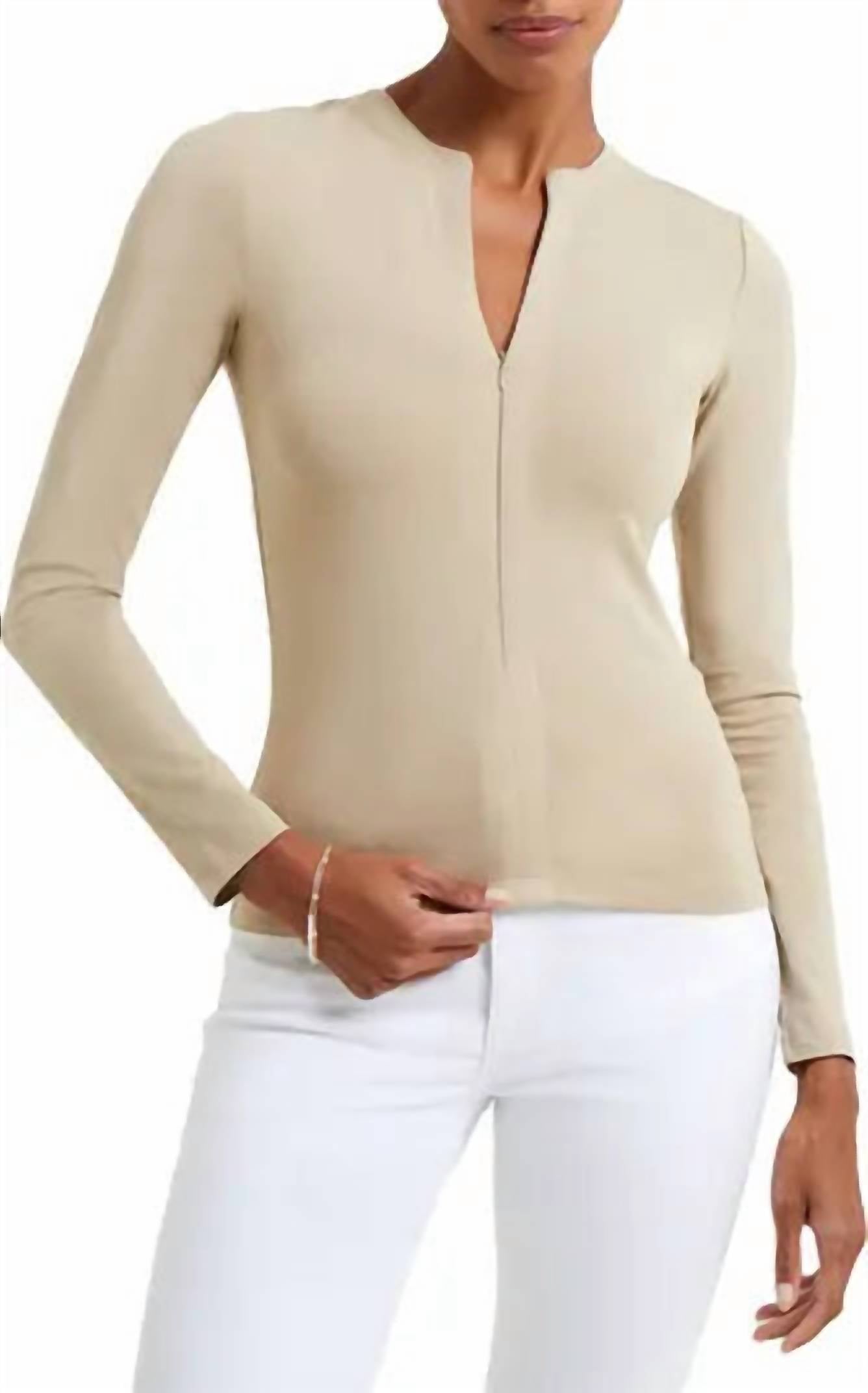 A long sleeve top you can wear with denim, skirts, well... just about anything! Experience effortless style with the FRENCH CONNECTION Zip It Top in a sophisticated taupe hue. This long sleeve top, featuring a V-neckline and a functional front zip closure, is crafted from a comfortable cotton blend. Care for this garment with ease using machine wash guidelines. Also available in white, perfect for versatile wardrobe options.