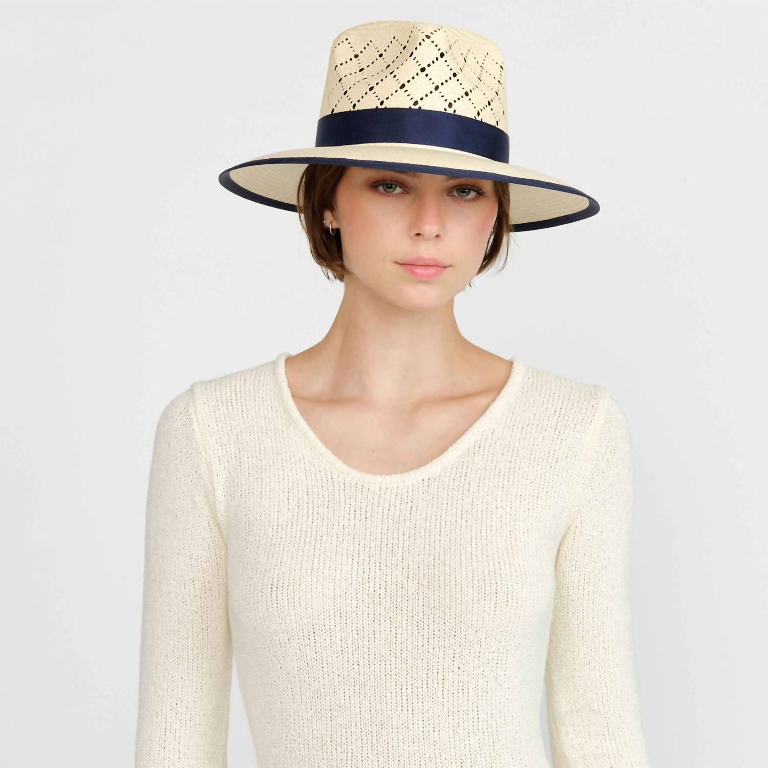 Introducing the Women's Marigold Hat by Freya, a sophisticated accessory in natural and navy. This hat features an intricately woven crown with a diamond-shaped vented pattern, complemented by a solid weave brim. A navy grosgrain ribbon trim adds a touch of elegance around the base and edge. Available in sizes Small/Medium (55-57cm) and Medium/Large (58-59cm).