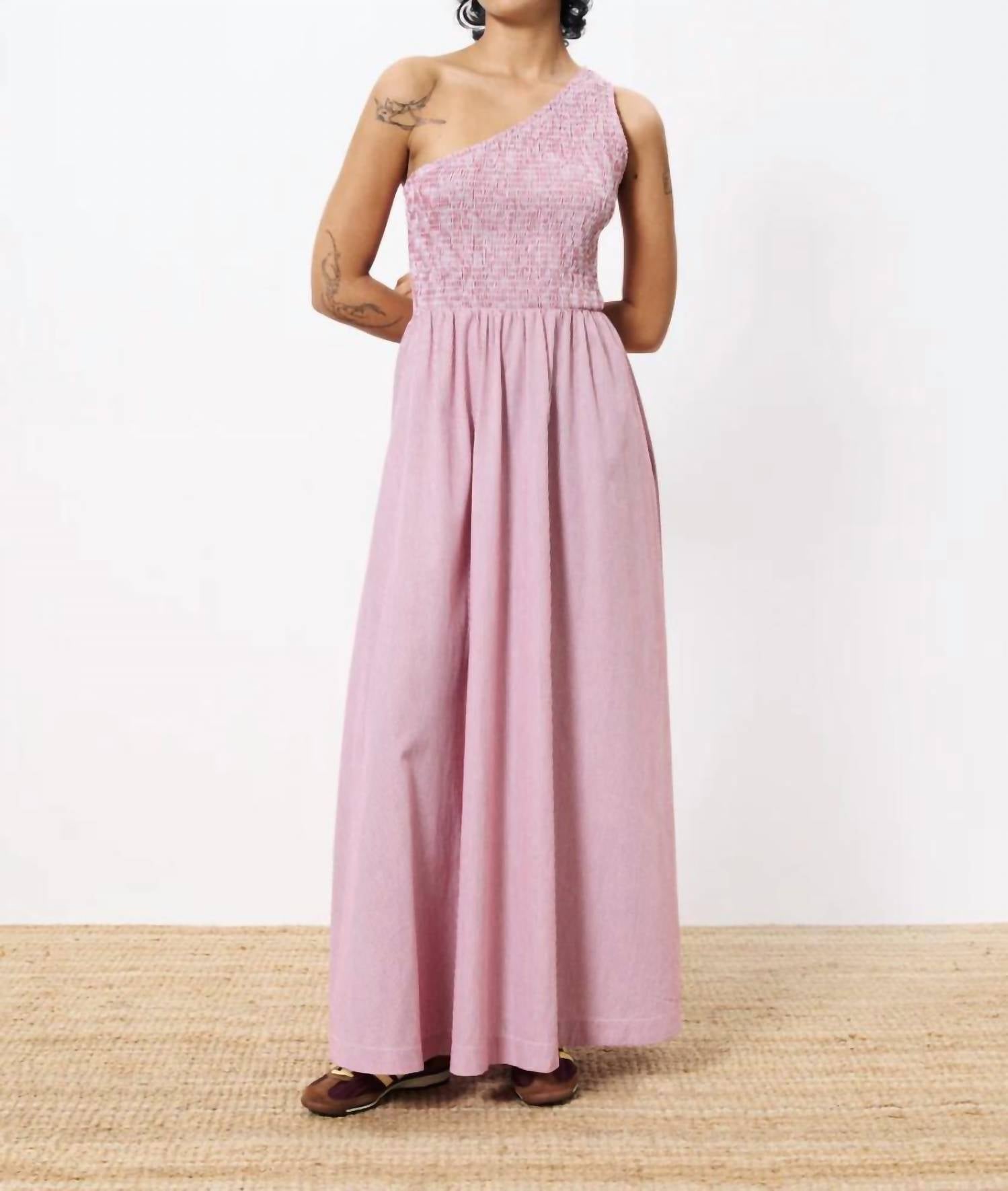 Introducing the Afsa Red Dress by FRNCH, a stunning embodiment of feminine grace and elegance. This sleeveless, off-the-shoulder midi dress boasts a unique one-shoulder strap design and an A-line silhouette. Crafted from comfortable, flowing 100% cotton in an exclusive FRNCH print, it offers a side zipper closure for a seamless fit. Made in China, this dress is perfect for prom and special occasions, exuding quiet luxury. Care: Hand wash only.
