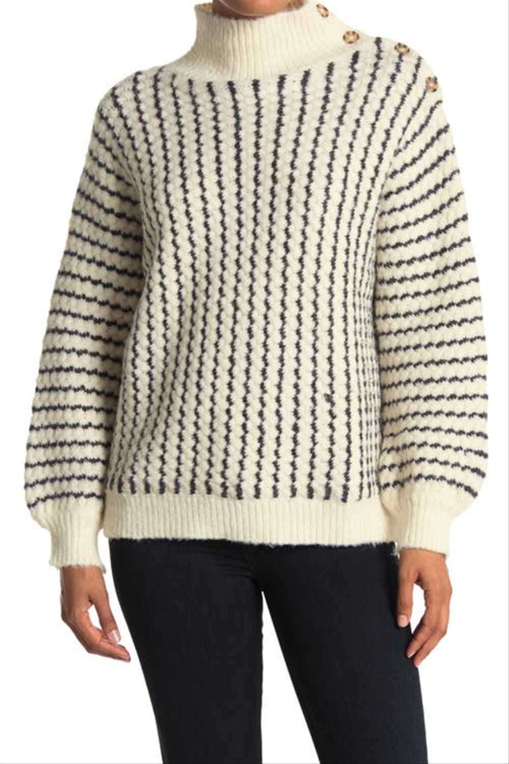 Mock Neck Design | Button Shoulder Detail | Black/White French Stripe | Medium Size | High-Quality Material |Cozy and Comfortable | Suitable for Fall/Winter Season | Ideal for Casual/Formal Occasion | Easy to Layer | Available at Nordstrom