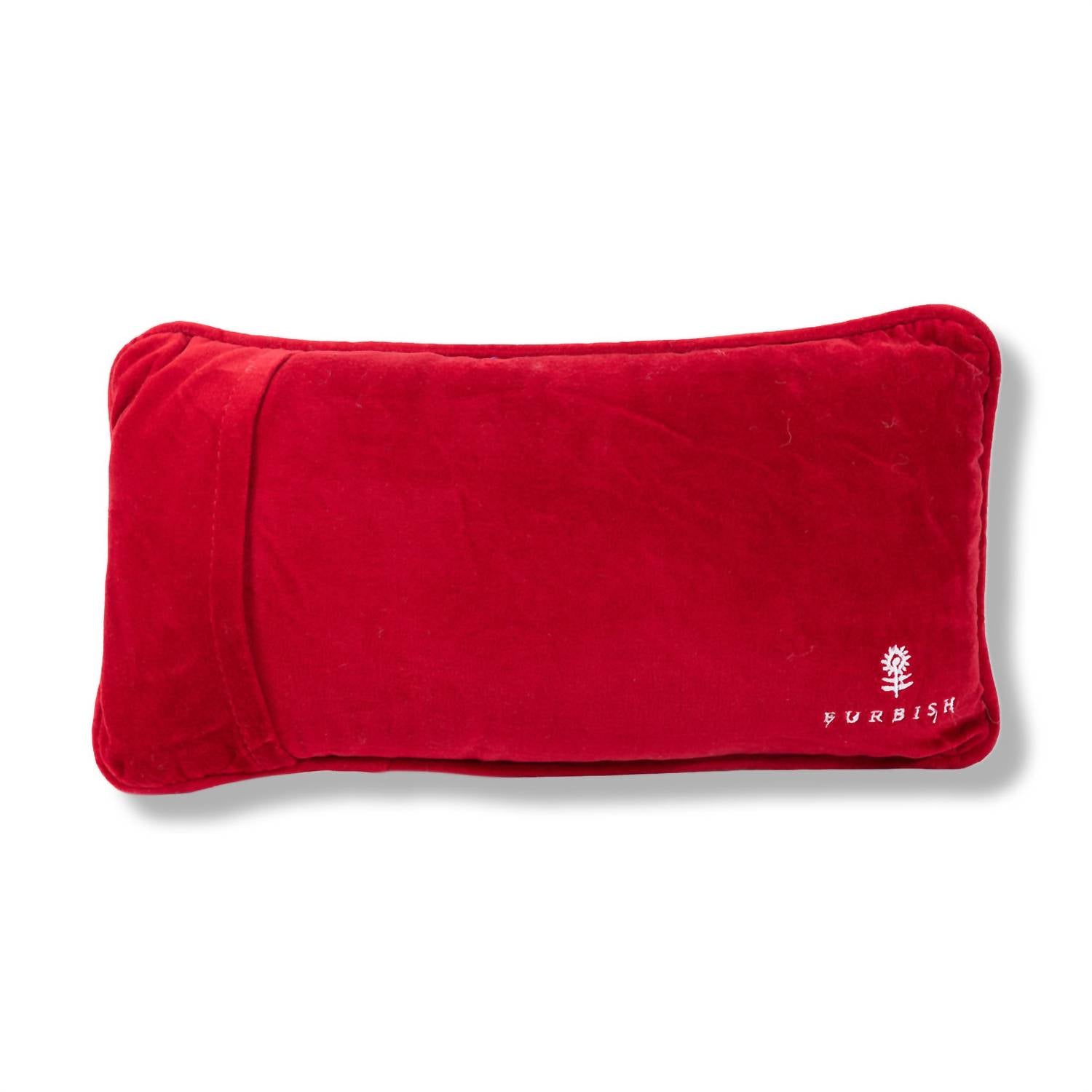Hand embroidered in wool and backed in luxe poppy velvet. Measures 8" x 14" - Small pillow.