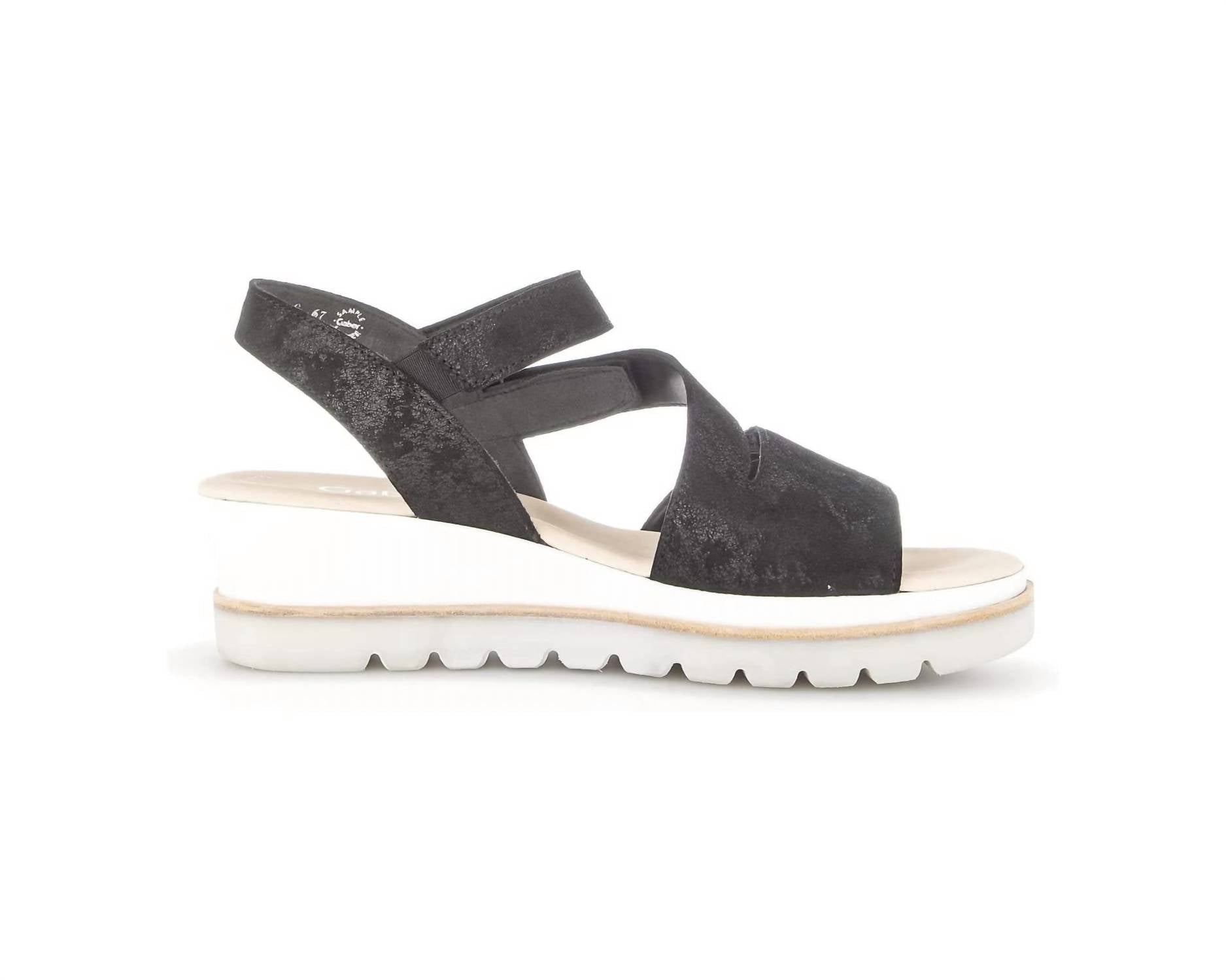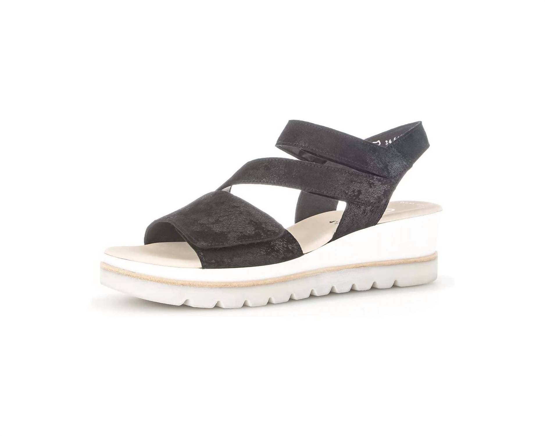 Elevate your footwear game with these adorable wedges.This wedge sandal features a 2-inch heel with a 1-inch platform for added comfort and height. It has a metallic nubuck upper and is leather-lined with a padded leather footbed for enhanced comfort. The sandal includes three adjustable Velcro straps for a secure fit. Made in Portugal.