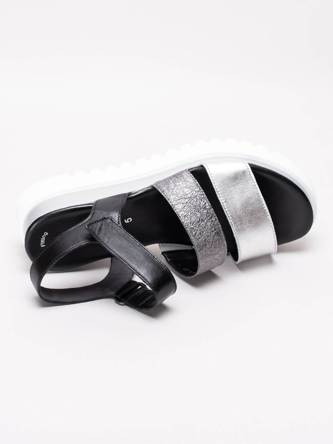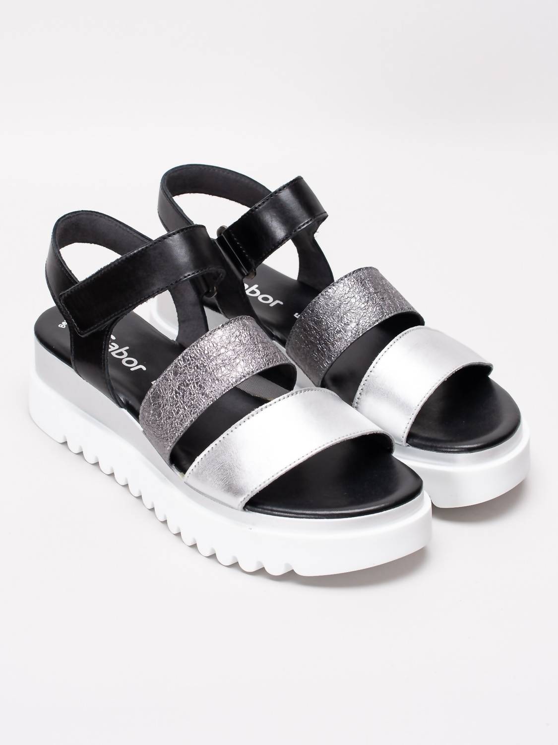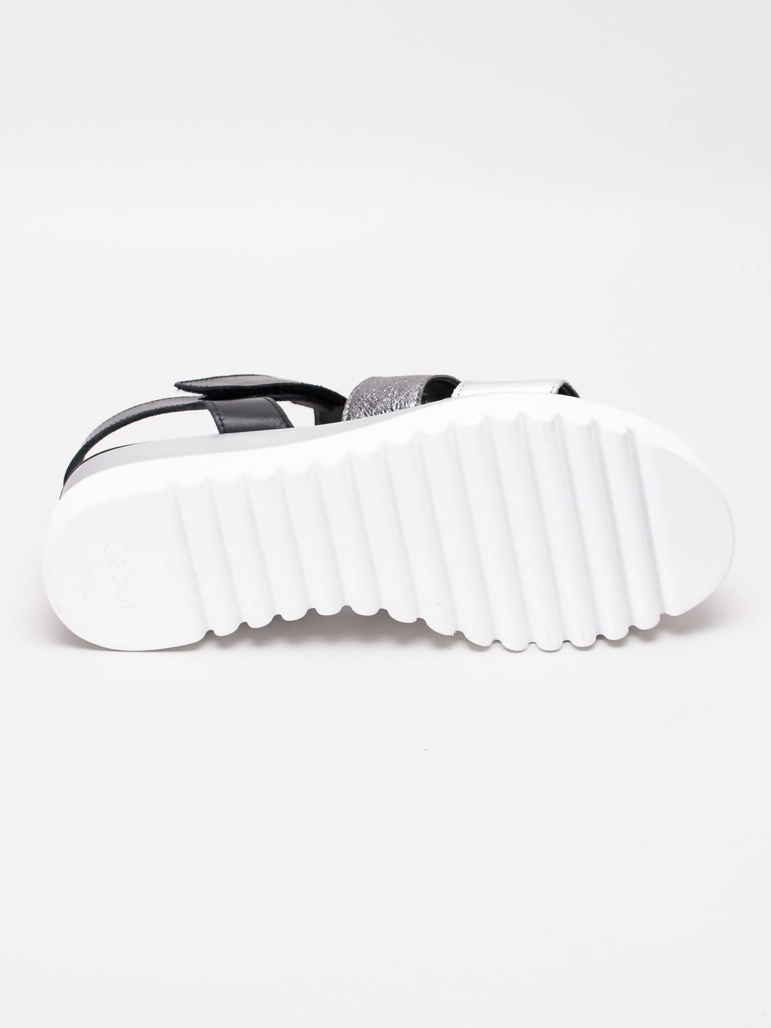 Flowy dresses, cropped pants, and even jumpsuits... this sandal works with them all! Step into sophistication with the Women's Platform Sling Sandal by GABOR, combining elegance and ease in black and silver. Featuring adjustable velcro ankle straps, these sandals are crafted from leather, promising style and durability. The design includes an open toe and a striking mid-platform heel, with heights of approximately 2.16 inches for the heel and 1.37 inches for the platform, ensuring comfort and a sleek silhouette. The synthetic outsole exhibits a wavy pattern, while the black lining and seamless logo detail add a touch of understated luxury.