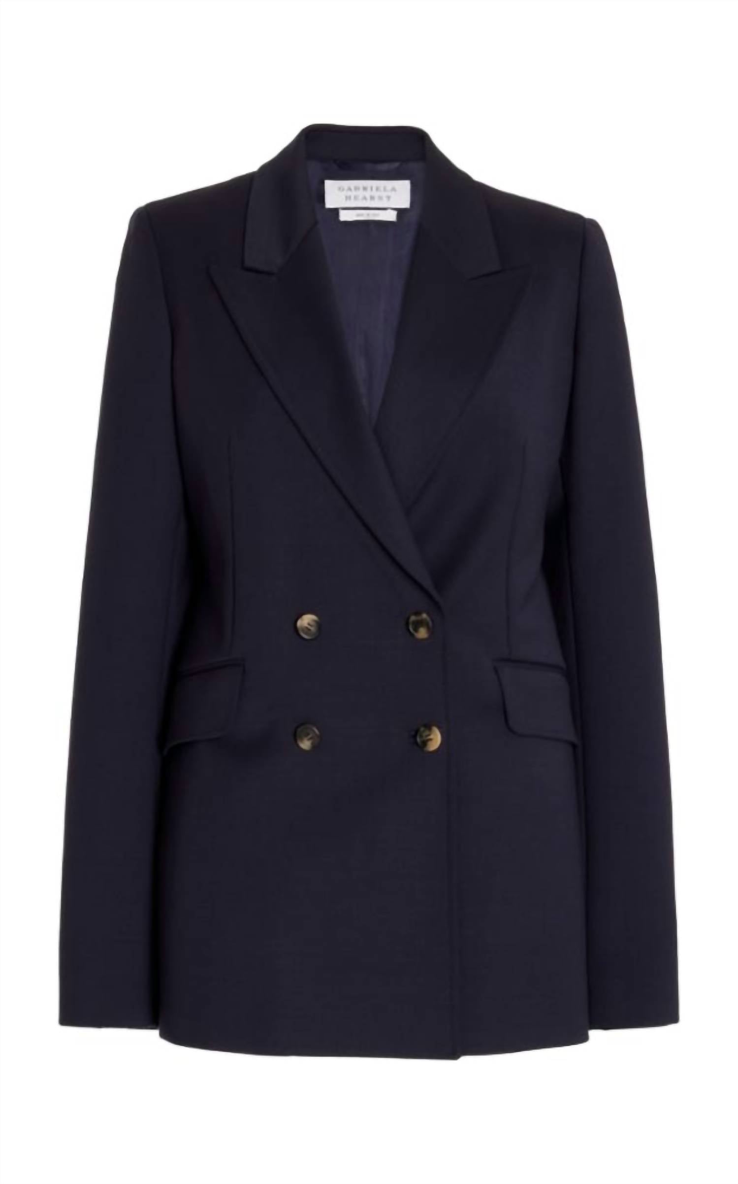 The Angela Double Breasted Blazer by Gabriela Hearst, in a sophisticated dark navy, epitomizes timeless elegance and luxury. Crafted from 100% wool, this mid-length blazer showcases long sleeves with button cuffs and traditional tailoring like a peak lapel collar and subtle pick-stitching for a refined finish. Made in Italy, it features a two-row button front closure and dual pockets, embodying a tailored fit that is ideal for black-tie events and workwear occasions. Care for this exquisite piece with dry cleaning to maintain its quality and elegance.
