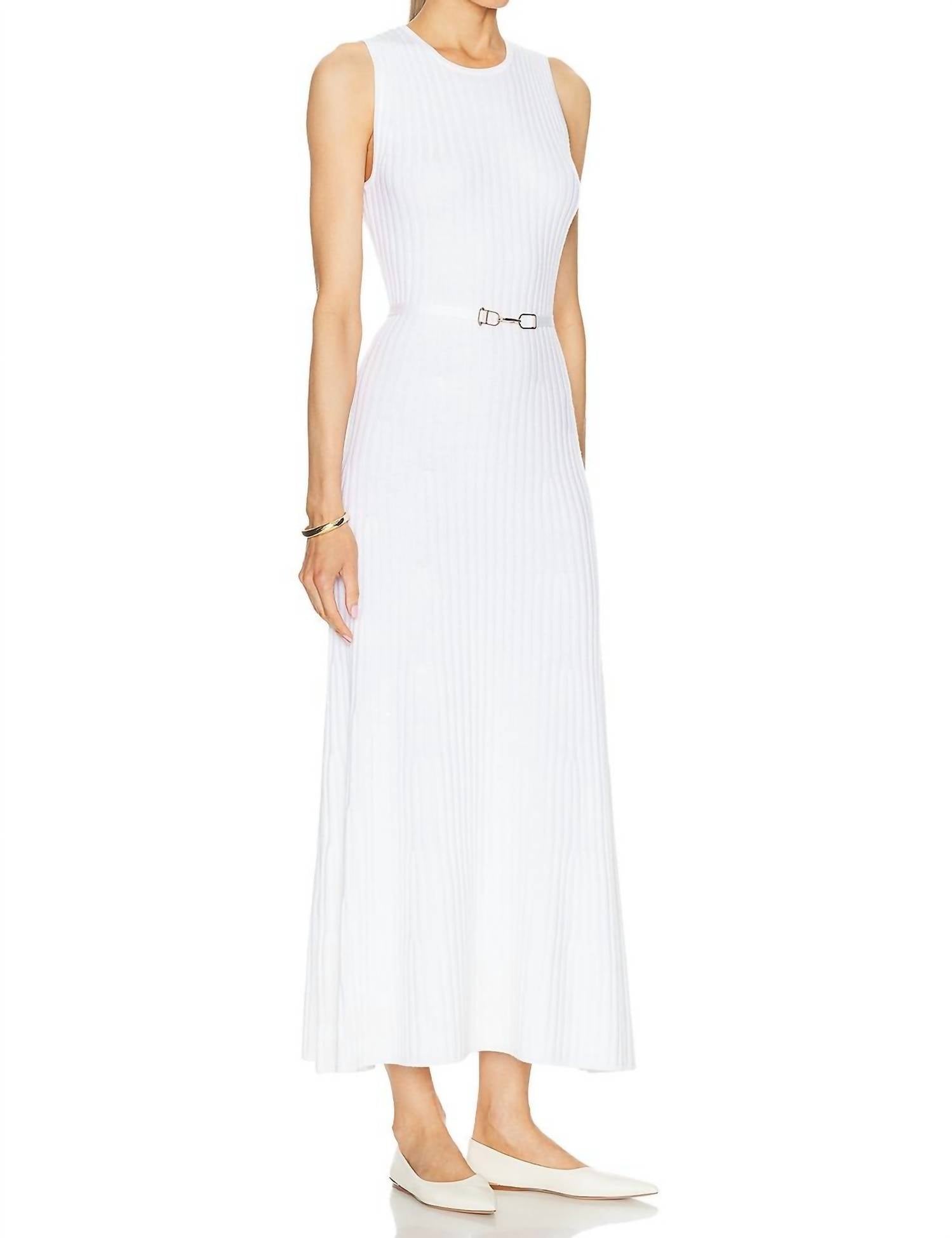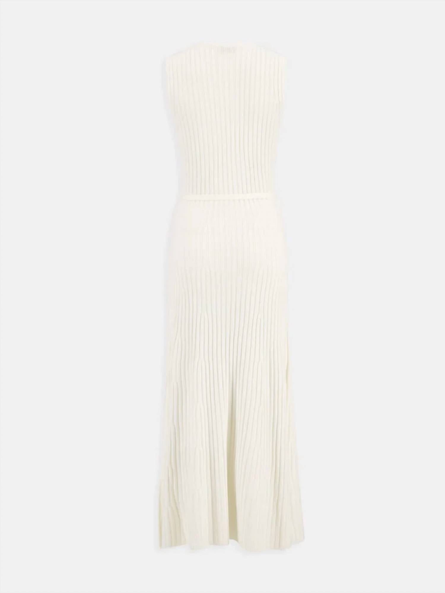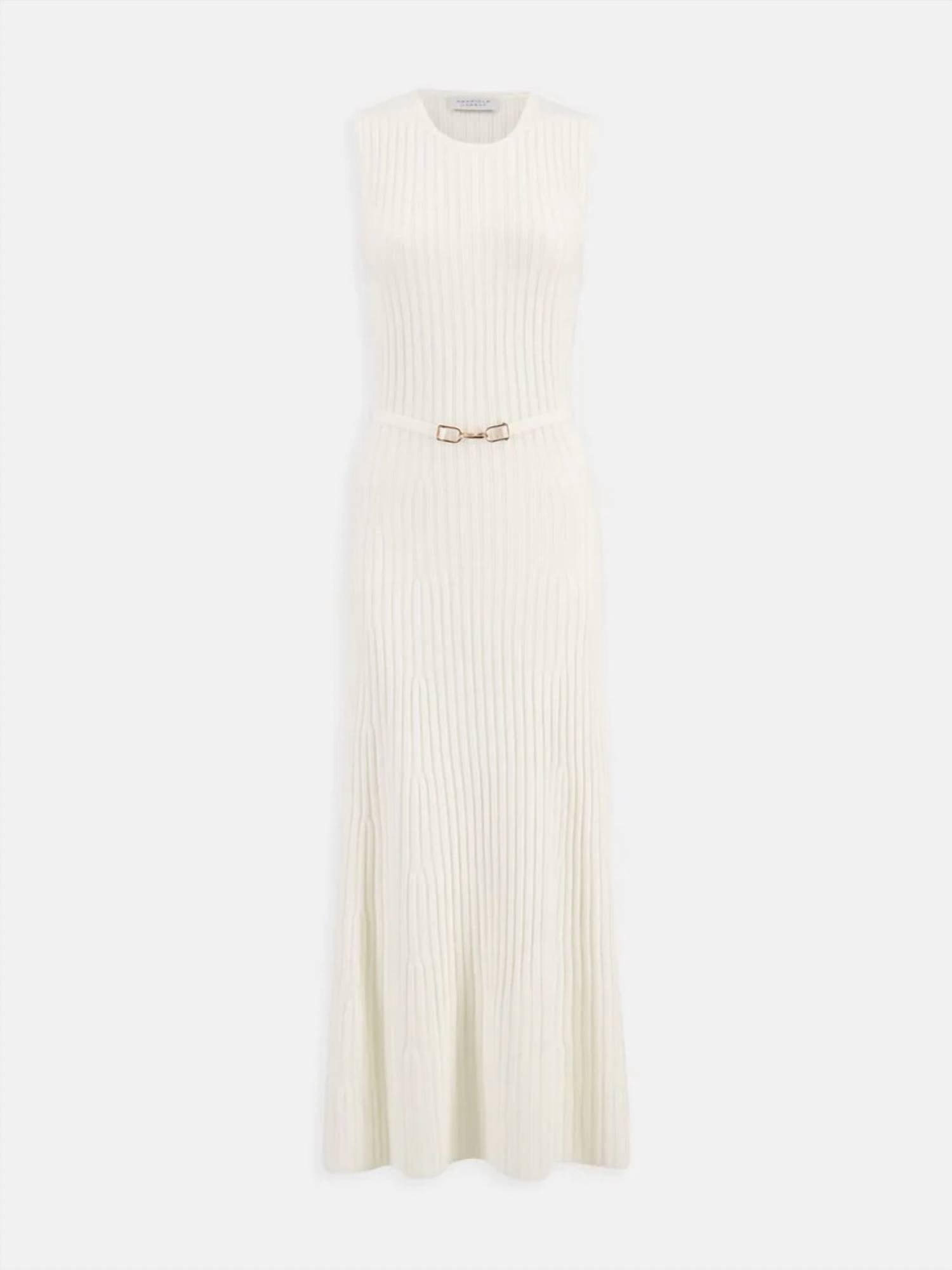 Just add slides or mules and you are good to go. The Meier Dress by GABRIELA HEARST is an embodiment of elegance in a luxurious ivory wool blend, featuring a sleeveless design perfect for a sophisticated silhouette. Crafted with a ribbed, textured pattern, it showcases a detachable horsebit belt to accentuate the waist. Composition: 90% Merino Wool, 10% Cashmere, with a convenient pull-on closure. Care: Dry Clean. This versatile midi-length dress measures 51 inches, offering a graceful blend of comfort and style for any dinner party occasion.