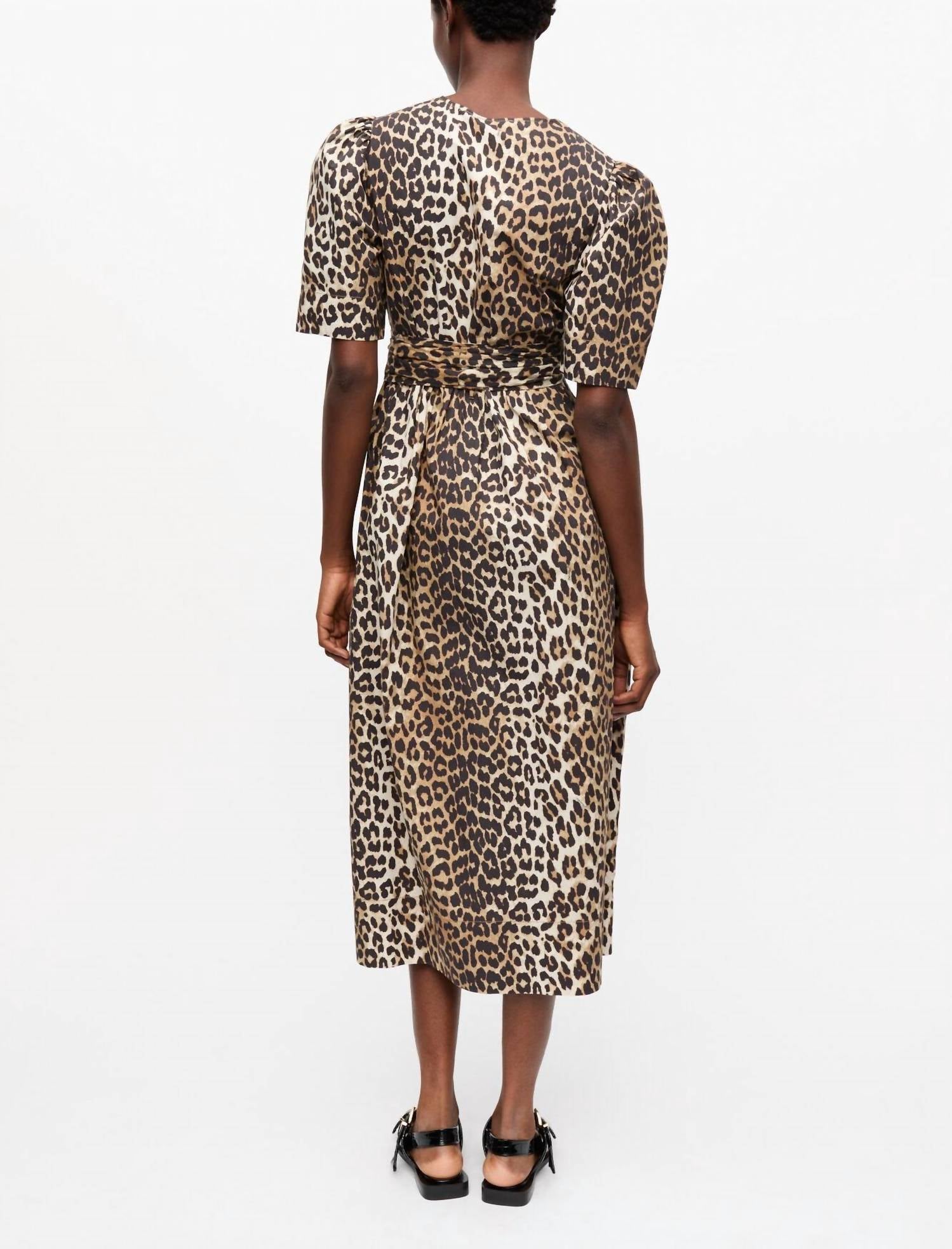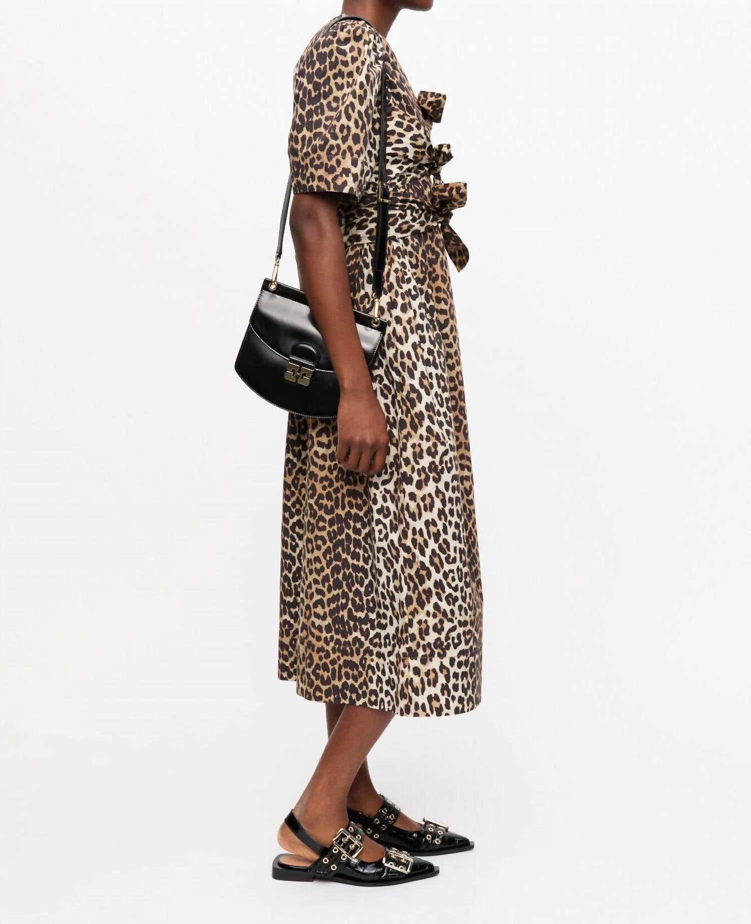 The perfect length dress does exist. Introducing the Leopard Printed Cotton Tie Strap Midi Dress by GANNI, an elegant statement piece perfect for summer occasions. This women's A-line midi dress features a deep V-neckline, short sleeves, and a chic animal print, crafted from 100% organic cotton. Closure is achieved through three tie bands at the front, adding a touch of sophistication. For care, machine wash and line dry to maintain its vibrant print and soft texture.
