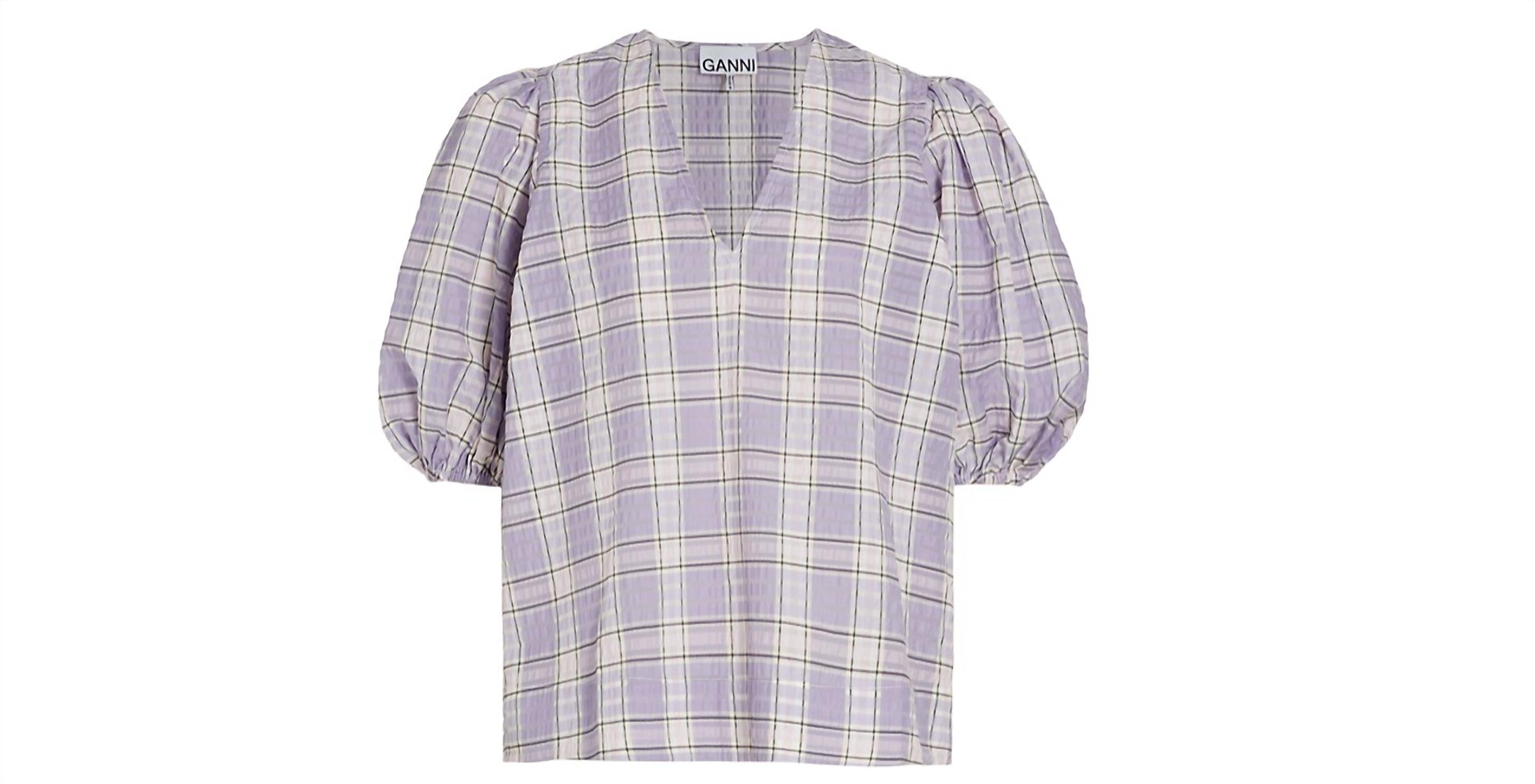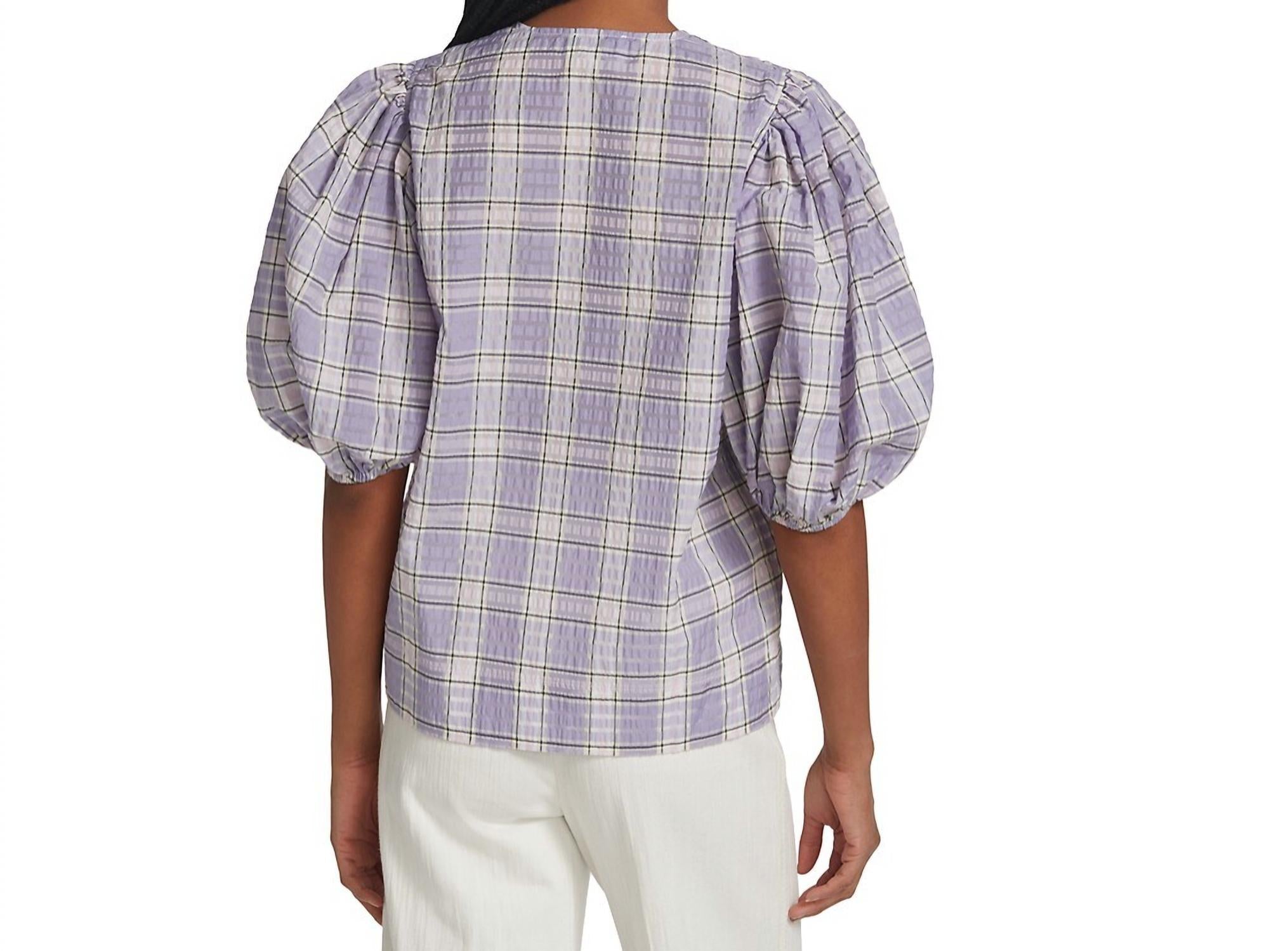 A versatile blouse that works from desk to dinner!100% Cotton. Imported. Machine Wash. Puff Sleeve. Lavender Plaid. About 25" from shoulder to hem