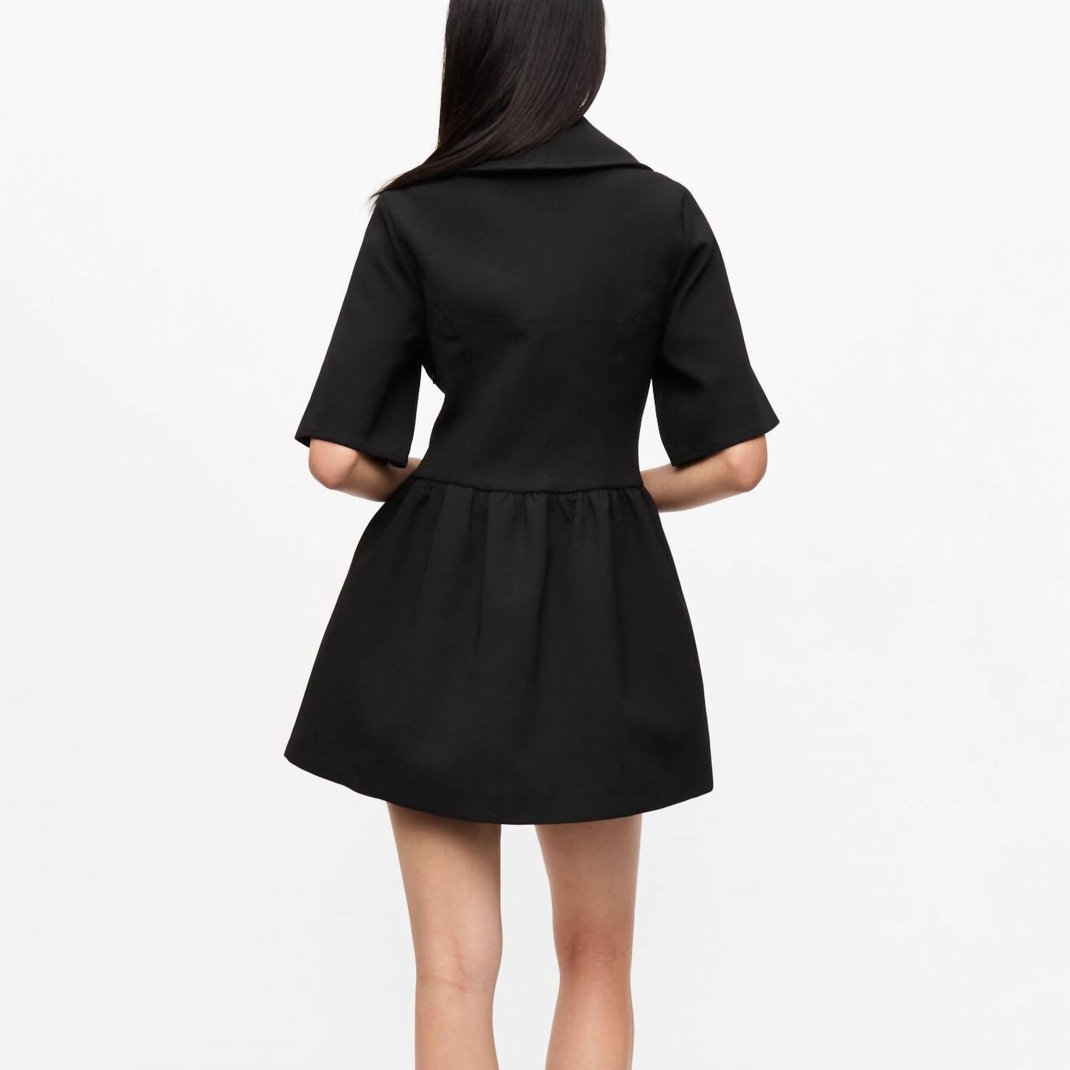 The Women's Bonded Crepe Mini Dress by GANNI combines elegance with sustainability, crafted from 100% recycled polyester with a luxurious viscose blend lining. Featuring short sleeves and a playful flared silhouette, this solid black dress is perfect for summer vacations. Its standout feature is the bold heavy zip closure on the high collar, which can be worn up or down. As an extra touch of practicality, it includes convenient pockets, aligning perfectly with the trend of quiet luxury.