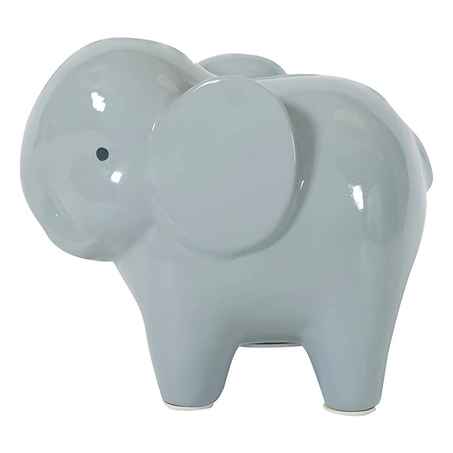 This elephant themed gender neutral coin bank is wonderful as an addition to your own baby supplies or as a gift for friends and family. Made from 100% ceramic. Measures 8.11" W x 6.8" H.