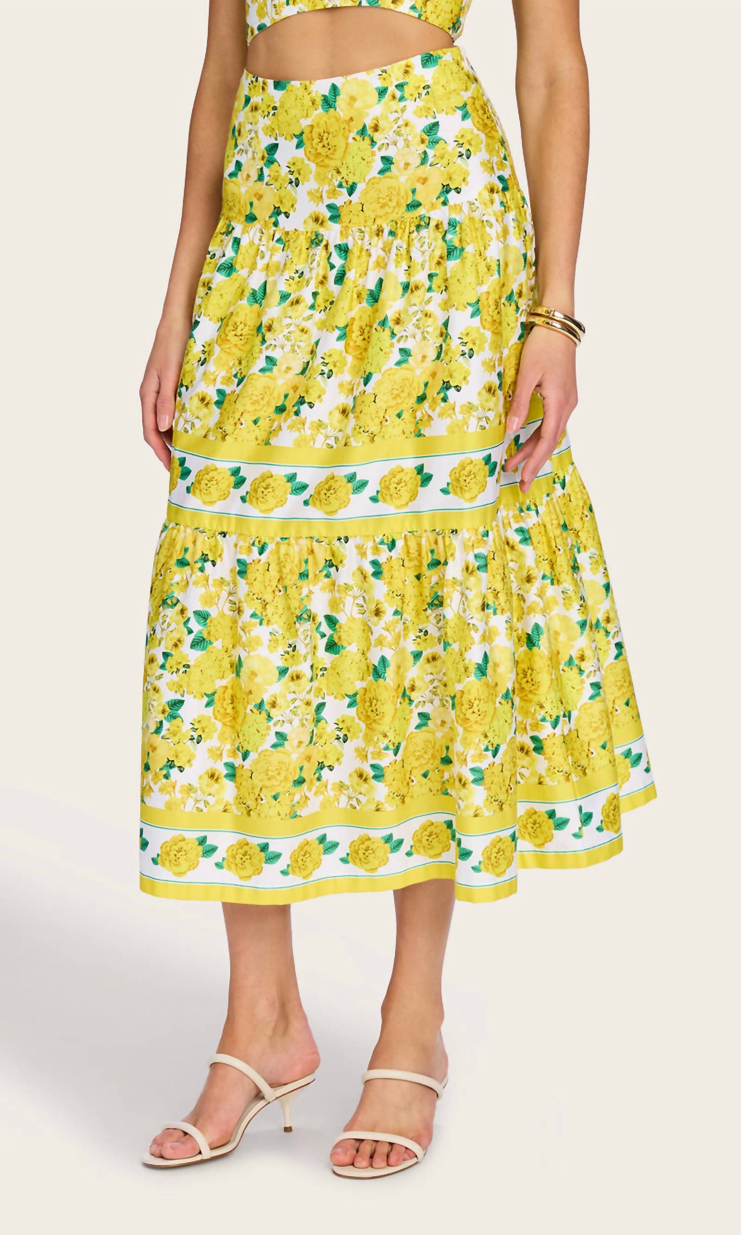 Tuck your favorite tee into this midi length skirt for an effortlessly cool look. The Mondo Floral Poplin Skirt by Generation Love brings a vibrant touch to your summer wardrobe with its Floral Fantasy White Yellow pattern. This tiered midi skirt is crafted from a comfortable 94% Cotton and 6% Elastane blend, featuring a regular fit and a stylish 35" length. Lined for added comfort, it closes with an invisible zipper. For care, machine wash warm and tumble dry low for easy maintenance.