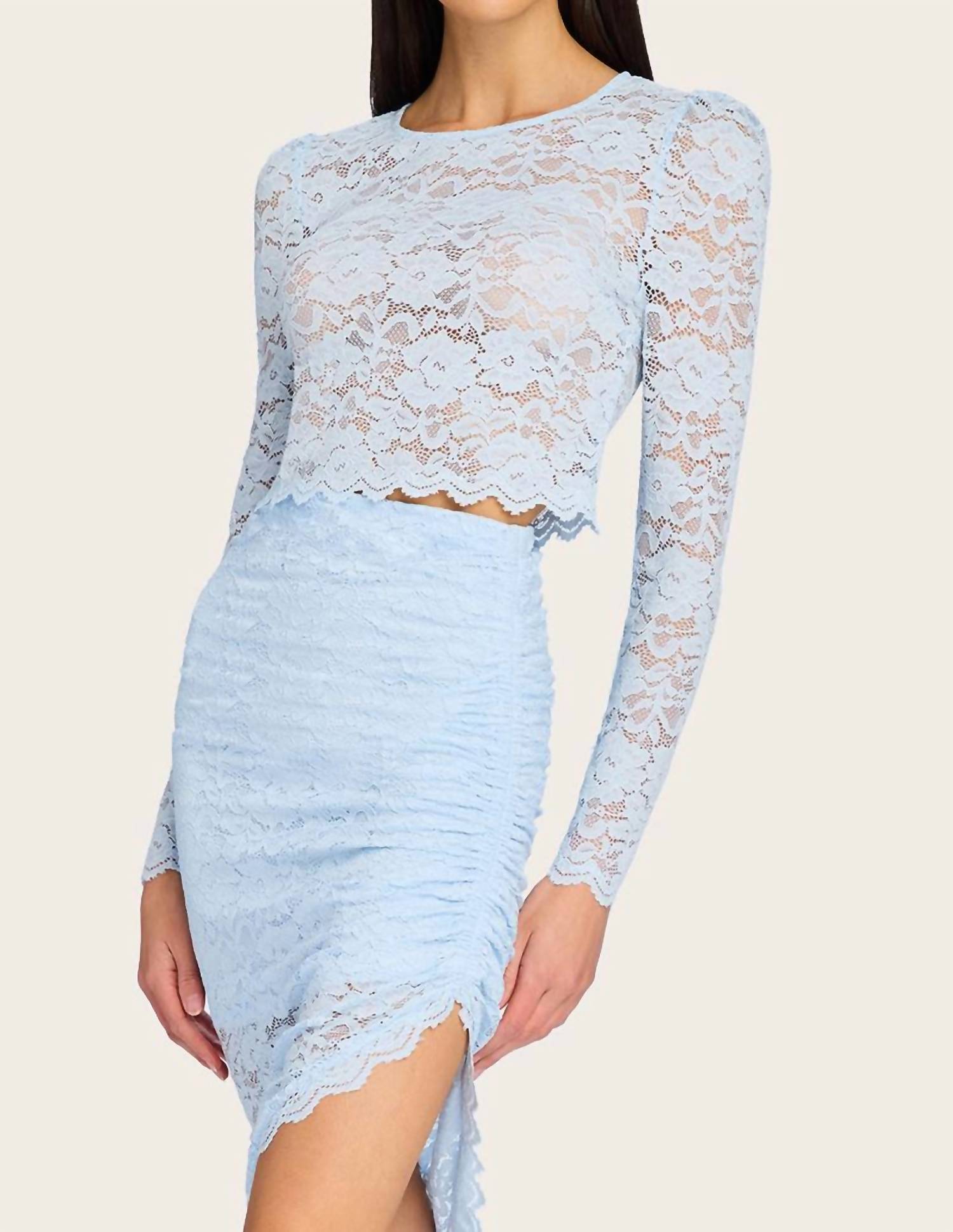 Show a little skin in this cute and casual crop top. Embrace femininity with the Safia Lace Top by Generation Love in a serene Powder Blue shade, radiating boho chic vibes. This textured crop top features long sleeves and a crewneck, capturing the essence of summer style. Crafted with a nylon blend (92% Nylon, 8% Elastane), it offers a slim fit and a length of 17 3/8". Originating from an unspecified location, it conveniently closes with a zip and is easy to care for with hand wash and line dry instructions. The model wears a size US 2/XS and stands at 5'10".
