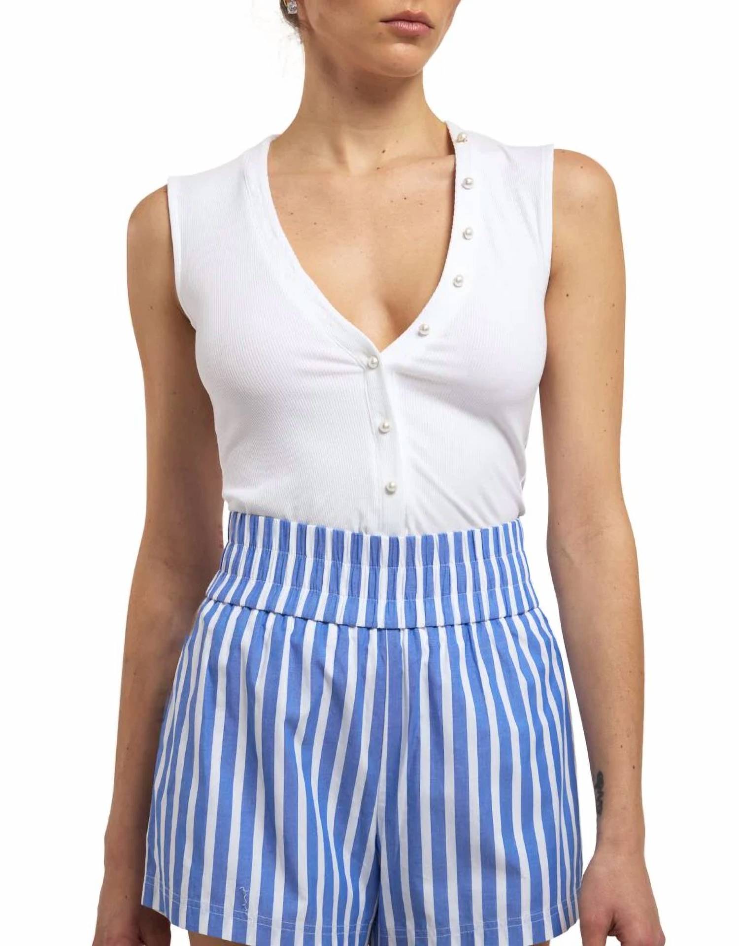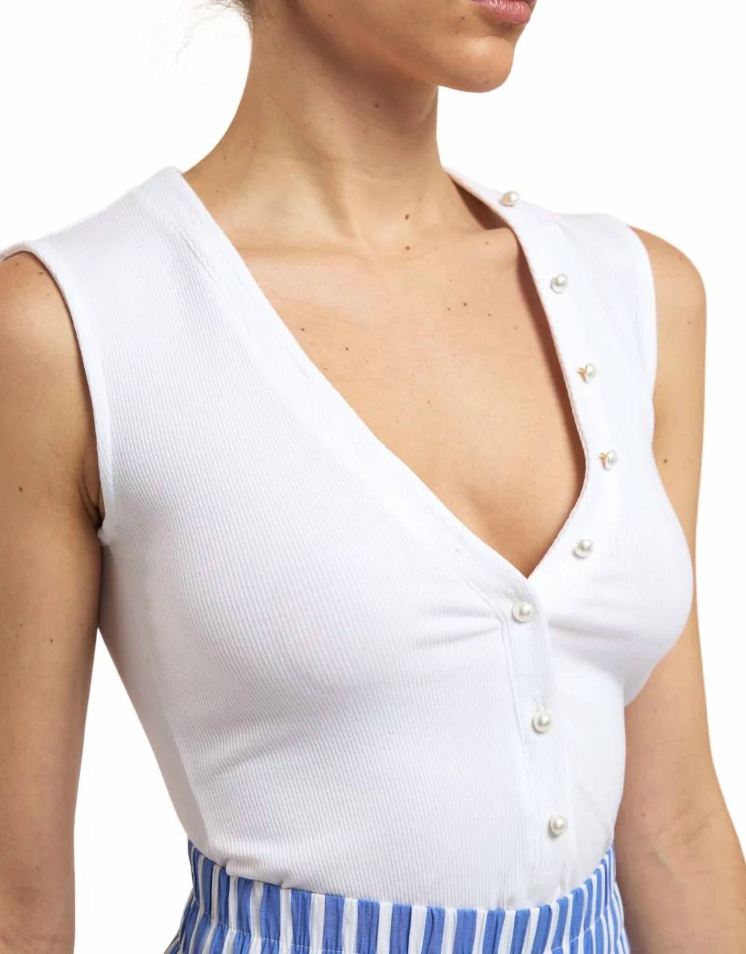 This classic tank top is perfect for layering and cute enough to wear on its own. Elevate your summer wardrobe with the Zoelle Rib Tank Top by Generation Love, a chic piece in classic white featuring a feminine V-neckline. This sleeveless design is crafted from a soft blend of 92% Rayon and 8% Elastane, providing both comfort and a flattering fit. The fine rib texture accentuated with delicate faux pearl buttons adds subtle elegance, making it perfect for pairing with tailored pants or a mini skirt. Length: 22 inches. Closure: Button closure. Care: Hand wash and lay flat to dry. Please note, this style runs large; we recommend sizing down for a slimmer fit.