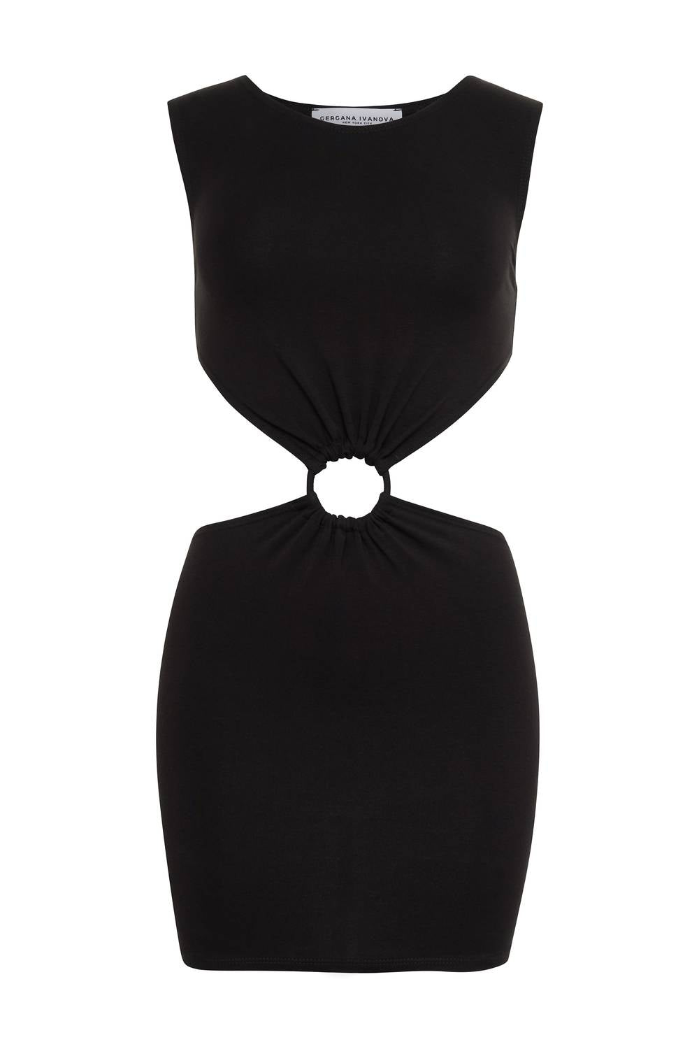 A short and breezy dress for those warmer days.Blend of zesty allure and timeless elegance. Sleeveless, mini bodycon dress is crafted from soft, breathable Modal. Known for its eco-friendly properties. Designed and made in US. Features include a statement cutout back and a distinctive metal ring at the center. Dry clean only to maintain its pristine condition.