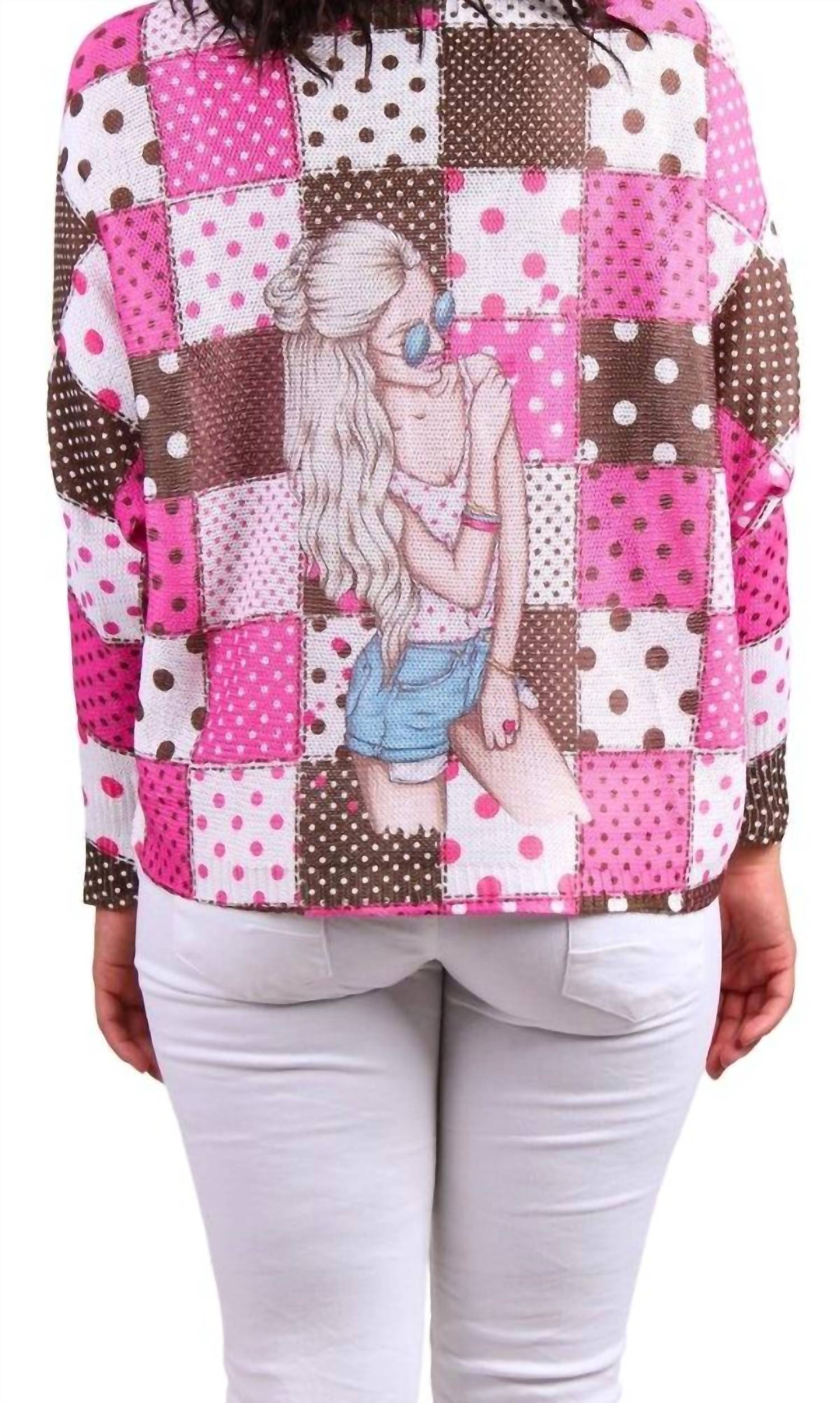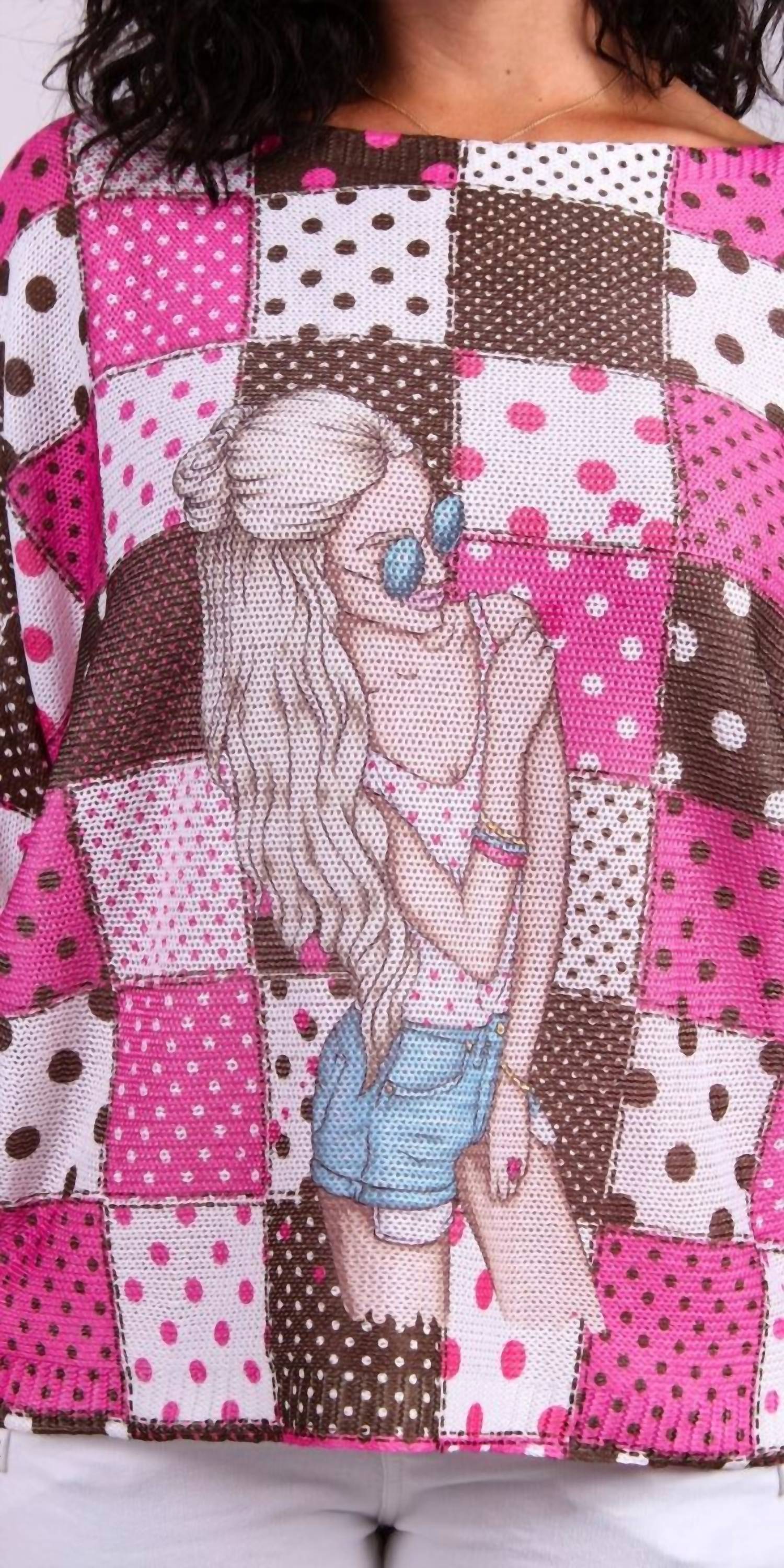 A classic fit that works just as good buttoned as it does left open. Introducing the Daria Checker Girl Print Batwing Sweater by GIGI MODA, a vibrant addition for your wardrobe in hot pink. Featuring long batwing sleeves and crafted from a blend of 65% polyester and 35% viscose, this sweater combines comfort and style effortlessly. Made in Italy, it offers a pull-on closure and fits most sizes, ideal for a casual yet chic look. Care: Machine wash as needed; perfect for making a maximalist statement this Spring.