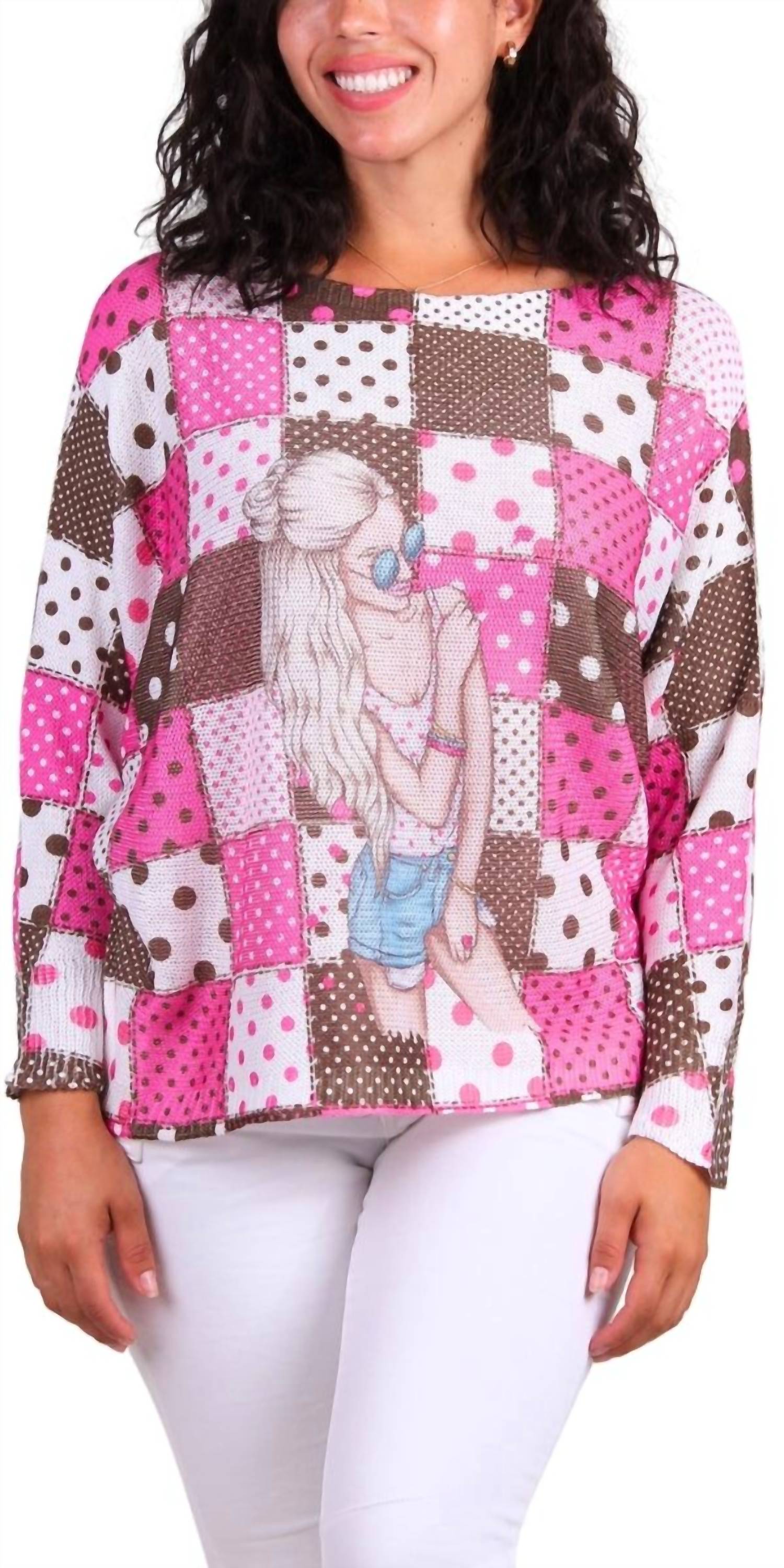 Introducing the Daria Checker Girl Print Batwing Sweater by GIGI MODA, a vibrant addition for your wardrobe in hot pink. Featuring long batwing sleeves and crafted from a blend of 65% polyester and 35% viscose, this sweater combines comfort and style effortlessly. Made in Italy, it offers a pull-on closure and fits most sizes, ideal for a casual yet chic look. Care: Machine wash as needed; perfect for making a maximalist statement this Spring.