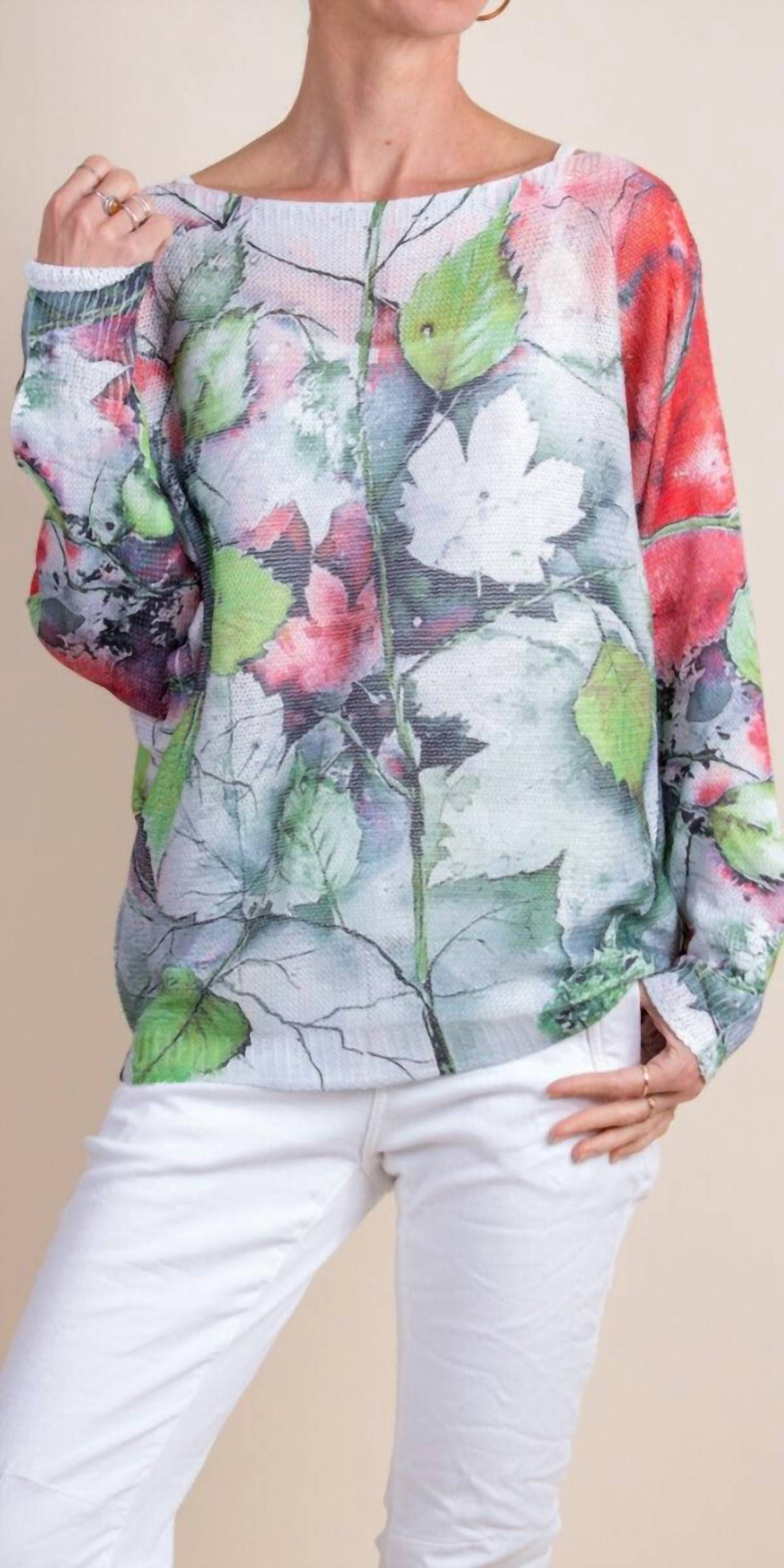 Embrace the spirit of fall with the Daria Fall Leaves Batwing Sweater by GIGI MODA, a boho-chic staple that captures the changing colors of the season. This women's sweater features long batwing sleeves and a playful floral pattern in a white and red palette. Crafted from a blend of 62% polyester, 33% viscose, and 5% elastane, this crewneck pull-on piece is made in Italy, offering both comfort and style. Designed to be one size fits most, this sweater complements your Thanksgiving wardrobe with its cozy and festive vibe.