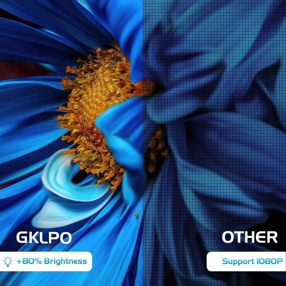 Upgraded Two-way Bluetooth 5.2 Technology: This portable projector has built-in the latest Two-way Bluetooth 5.2 technology. This means it can be seamlessly connected to Bluetooth speakers and also used as a speaker to connect to smartphones and tablets. This function solves the big problem that most projectors on the market cannot connect to smartphones or laptop with Bluetooth. | Support 1080P Resolution: This mini video projector features an upgraded color light output, the native resolution is 720P and supports 1080P, which delivers a Full HD clear, dynamic and color vibrant image quality. With the latest 3LCD Technique and 80% enhanced Color Brightness compared with other typical projectors, as well as 90% increased White Brightness, this easy-to-operate & carry 4 Inch mini LCD projecteur is real value for money. | Portable Projector Screen Included: Our portable projector includes a 80" projection screen that is tailored to meet our customer's needs. As opposed to other projectors, our included projector screen allows you to set up your own home theater anywhere to watch movies, TV shows, photos, and play video games. This portable, foldable, anti-wrinkle and easy to wash 100" projection screen is an Added Bonus, perfect for Daily home theater use. | Projector with Wide Compatibility: This outdoor movie projector is equipped with multiple ports for ease of use, including a built-in HDMI, USB, TF Card, VGA, and AV interface. You can connect this projector to a TV Stick directly, as well as Game consoles, PCs, Smartphones, Tablets, Laptops, DVD player, Micro SD card and USB flash drive, etc. | Low Noise & Long Lamp Life: The Mini projector is lower in noise and more durable than previous models thanks to advanced fan cooling technology. Powerful cooling system cools the heat of lamp efficiently, extending the bulb life to 50,000 hours, which means you can use it more than 15 years. | 3 Year Satisfied Service: GKLPO team offers every customer a 100 percent satisfaction guarantee. If you have any problems while using it, please feel free to contact us. Please rest assured that we also have a 3-year after-sale service. Not recommended for PPT or business presentation, it is a home theater projector. Just feel free to enjoy a fun outdoor home theater.