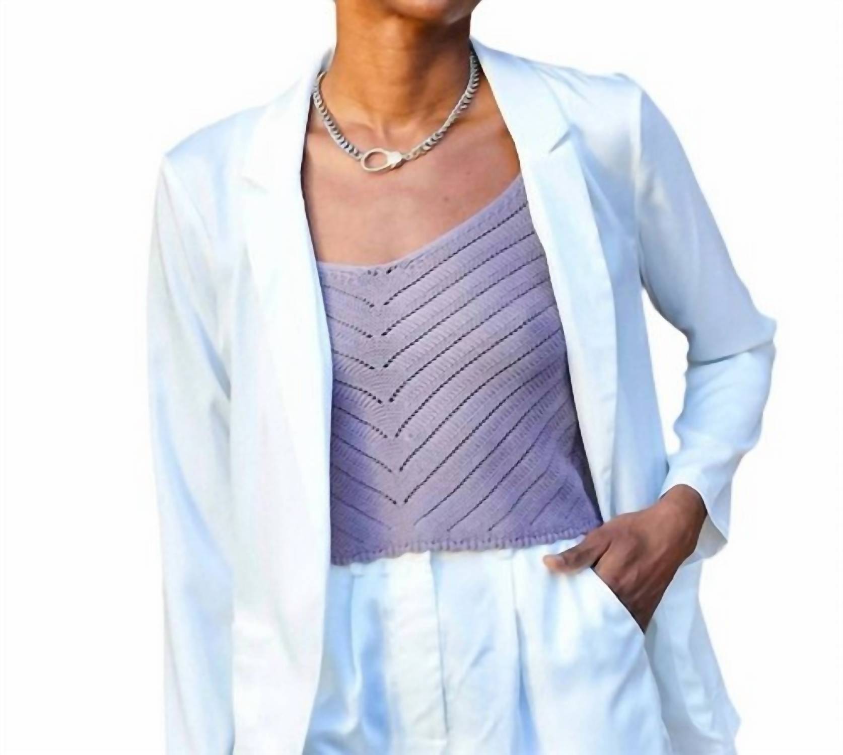 Introducing the All the Lights Blazer by GLAM, a must-have for your wardrobe in a crisp white solid color, perfect for New Year's Eve or a dinner party. This women's blazer features long sleeves, a classic notched lapel collar, and practical front patch pockets for added utility. Made from a comfortable blend of 97% polyester and 3% spandex, this relaxed, slightly oversized piece offers both style and stretch. Closure type: Button closure. Care instructions: Machine wash and tumble dry.