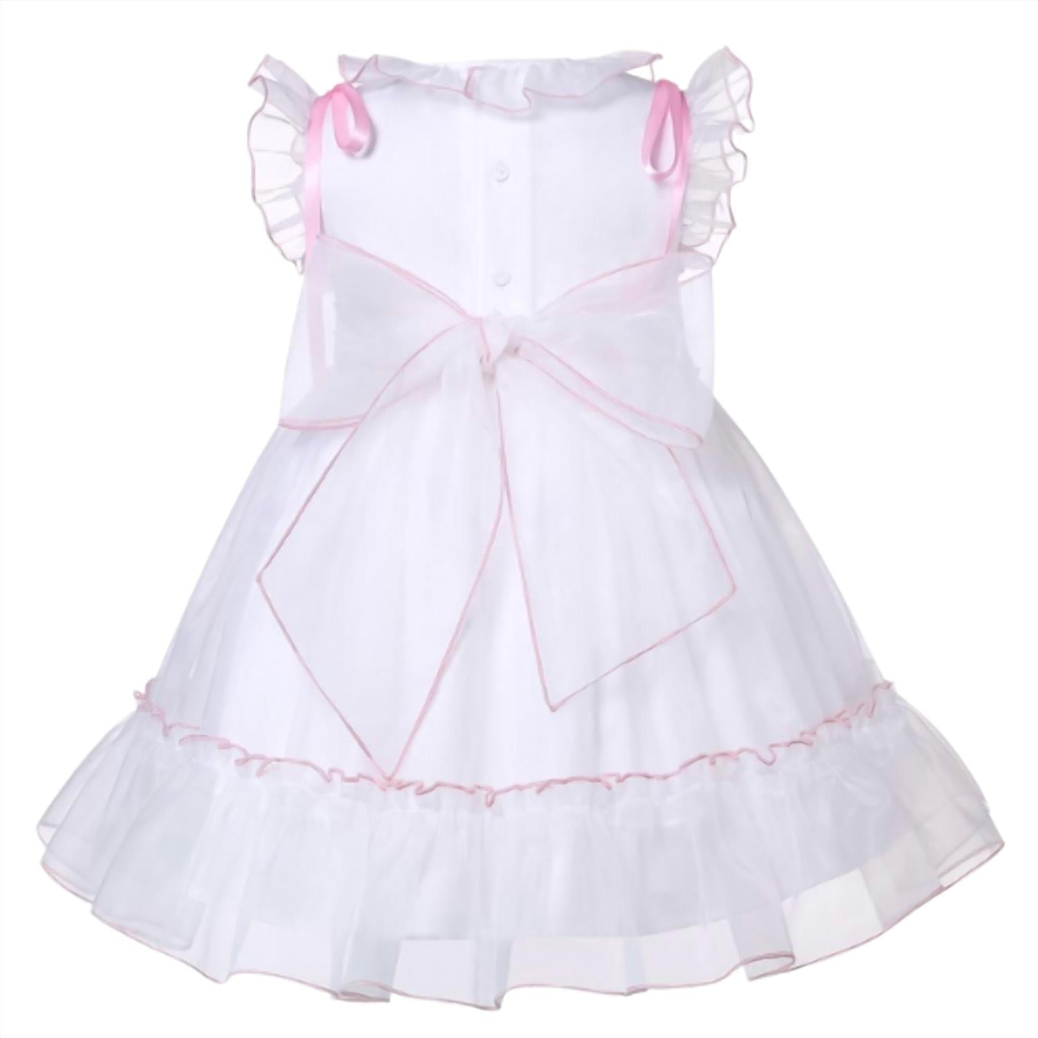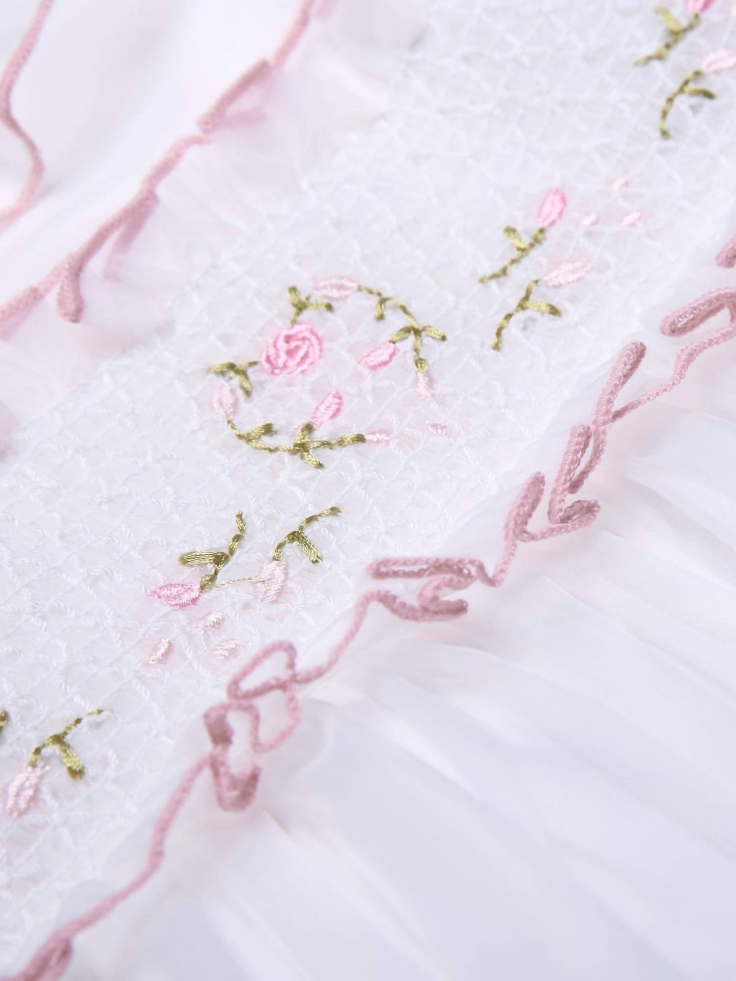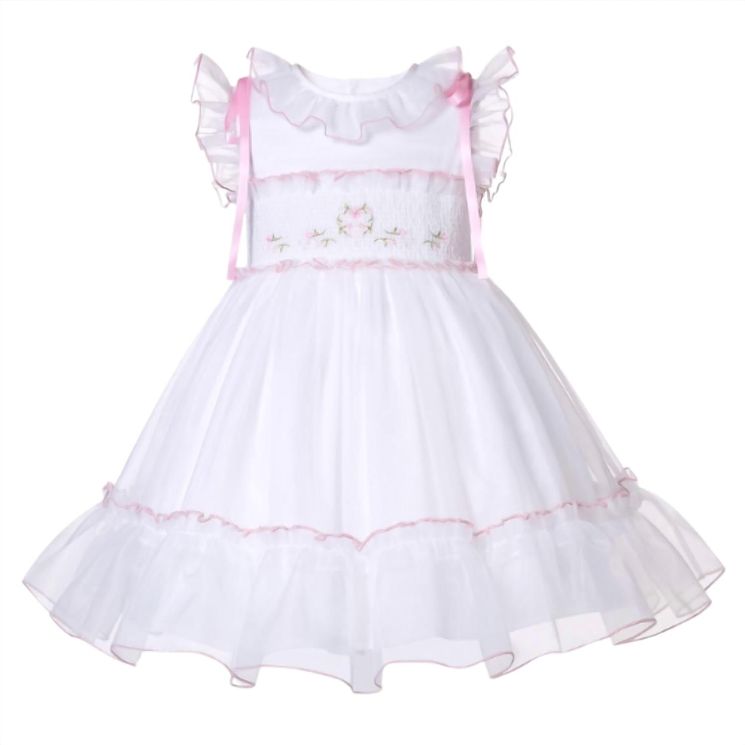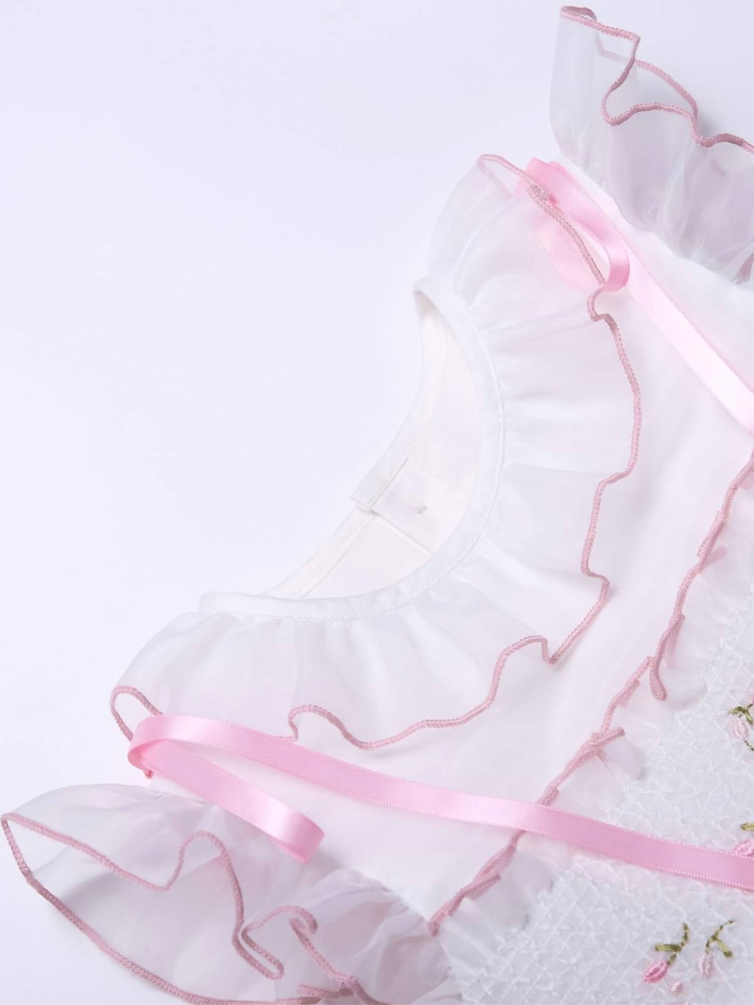 Introducing the Kid's Lace Daydream Dress by Glam Collections, a charming fairytale-inspired piece in a delightful pink hue. This formal dress features adorable ruffle sleeves and a twirly layered skirt, adorned with delicate pink lace and hand-embroidered floral smocking. Material: Cotton Blend, offering a super soft and breathable fabric ideal for summer celebrations. Perfect for weddings, birthdays, and garden parties, this dress is made to create picture-perfect moments.