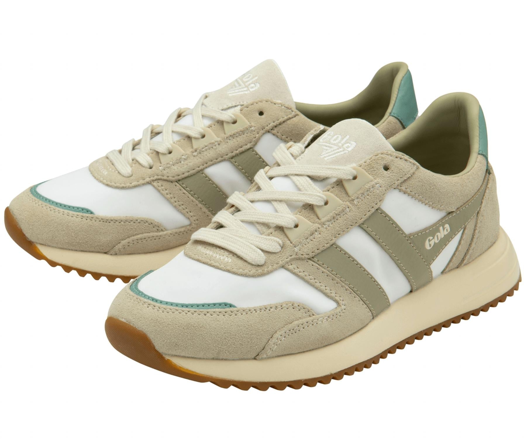 Meet the Women's Chicago Sneakers by Gola, an homage to classic '80s streetwear with a contemporary twist. These off white, wheat, and feather grey sneakers feature a chunky phylon midsole and recycled parachute nylon upper. Designed with a round toe and flat heel, they are perfect for travel and everyday wear. Embrace the heritage jogger aesthetic this fall with a sneaker that combines striking fashion and sustainable materials.