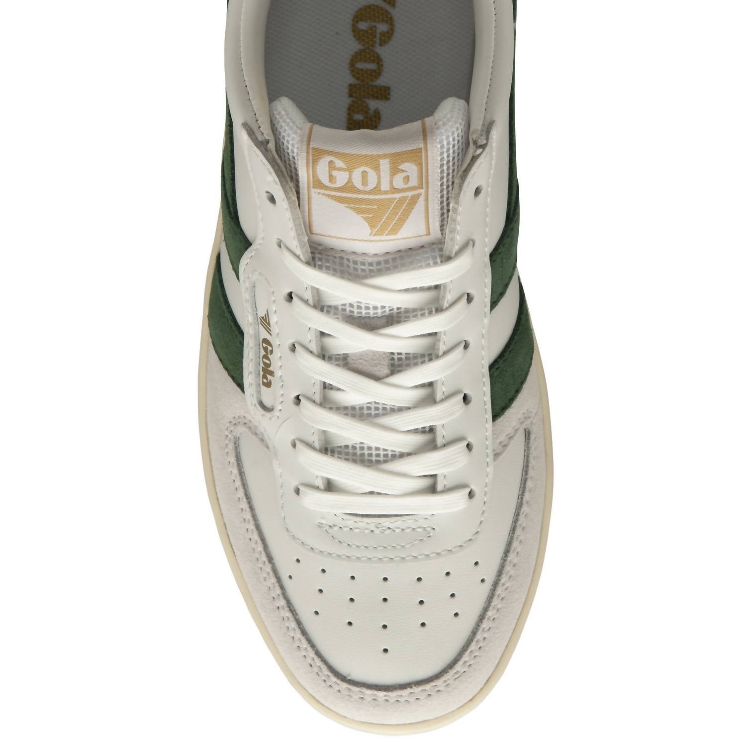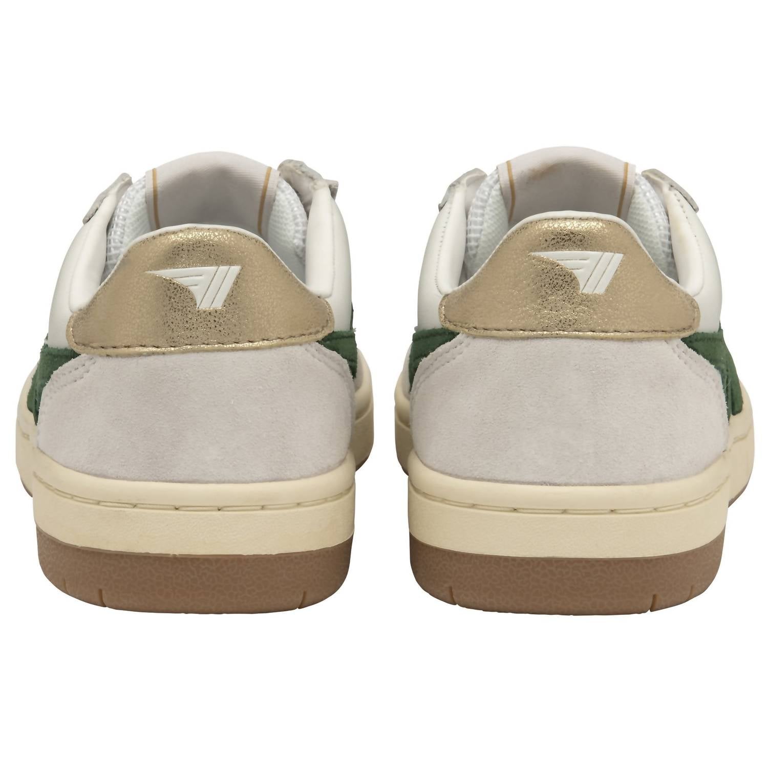 Cute, functional, and comfortable. These sneakers check all the boxes. Introducing the Women's Hawk Sneakers by Gola, timelessly crafted for the streetwear trend with a relaxed '80s vibe. These stylish sneakers feature a combination of leather, suede, and mesh, showcasing a striking white, dark green, and gold color palette. Designed as a heritage sneaker with a classic court style, they boast a comfortable flat heel and open toe, ideal for summer music festivals or even St. Patrick's Day celebrations. Available in medium shoe width, they pair effortlessly with loose denim or your favorite midi skirt.