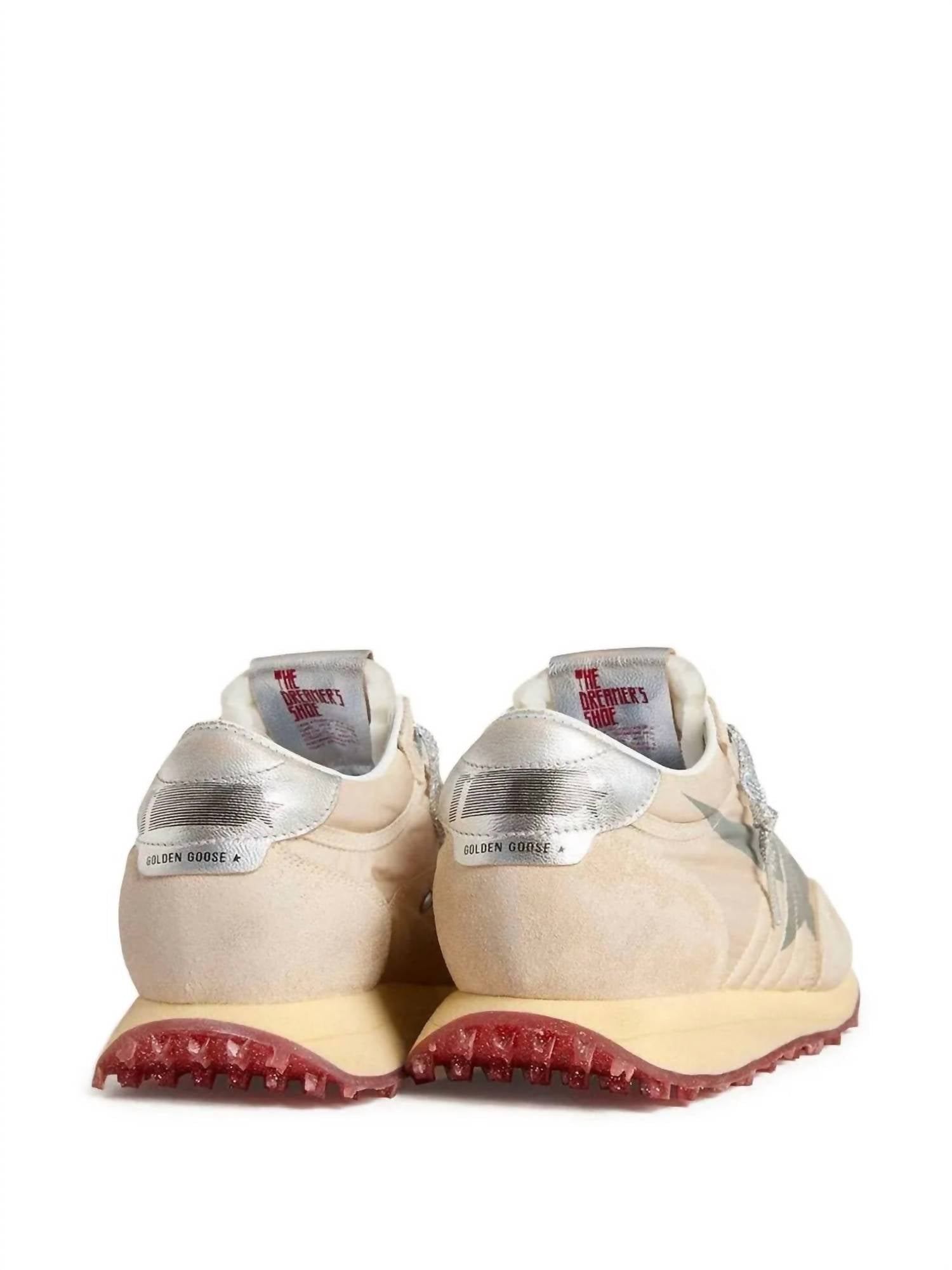 When fashion and function come together seamlessly. Unleash your inner athlete with the Marathon Sneaker by Golden Goose, crafted with a Seventies flair. This women's sneaker boasts a beige nylon upper with beige suede inserts, accented by a stylish gray star and a striking silver metallic leather heel tab. Composed of 49% polyamide, 38% cow leather, and enhanced by silver lurex laces, it features a 100% rubber sole for durability. Made in Italy, these sneakers are a perfect blend of streetwear trend and fitness readiness, elevating your casual ensemble with a unique starred outsole.