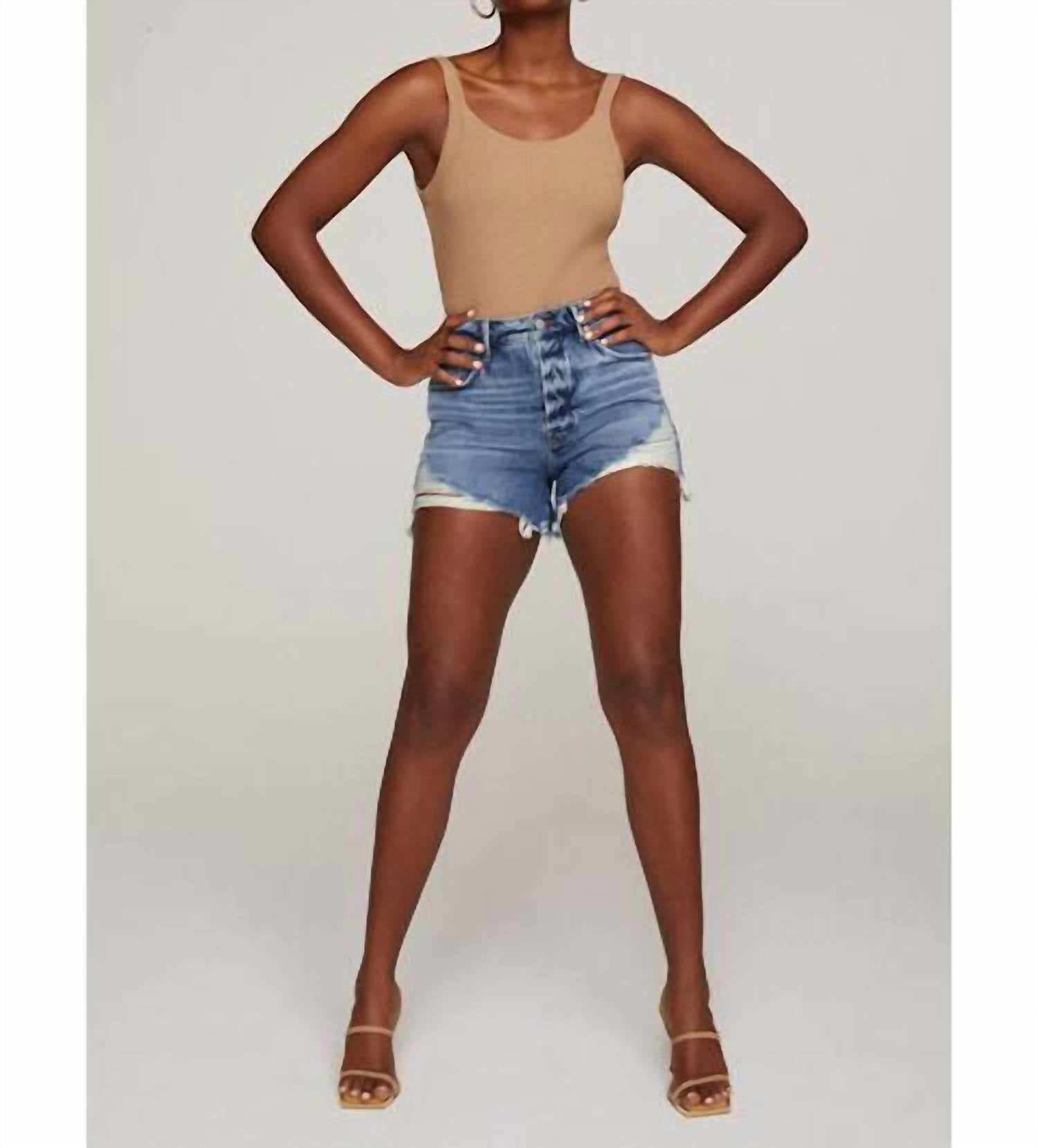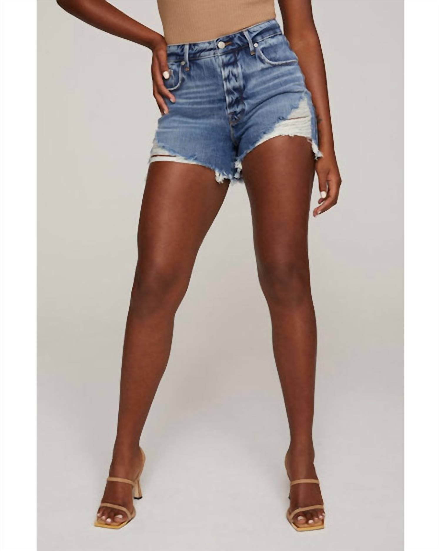 Introducing the Bombshell Short by GOOD AMERICAN, embodying streetwear chic in a medium wash. These high-rise shorts feature button fly closure, with distressing at the thighs and frayed hems for that perfect edgy look. Crafted from a sustainable cotton blend of 69% Recycled Cotton, 30% Lyocell, and 1% Elastane, they reflect an eco-conscious design ethos. Care for these stylish shorts with a simple machine wash routine, and step out in style this summer.