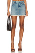 Features a zip fly with button closure, 5-pocket styling, and a frayed raw-cut hem for a casual, worn-in look. Made from 79% cotton, 20% recycled cotton, and 1% elastane, it is machine washable. The model is 5'10" and is wearing a size 0. The skirt measures 14 inches in length.