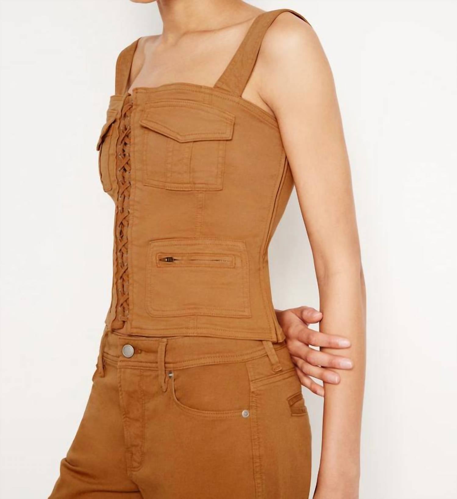 Fit, fabric and functionality. This tank top checks all the boxes. Introducing the Twill Lace Up Tank by GOOD AMERICAN, a must-have for any concert-ready wardrobe in a chic brown hue. This sleeveless tank features wide shoulder straps and a distinctive square neckline for a modern look. Crafted from a textured cotton blend, it includes functional chest flap pockets and front zipper pockets. Designed with a side zipper closure for easy wear, its cropped length enhances its streetwear appeal. Care: Machine wash and tumble dry.