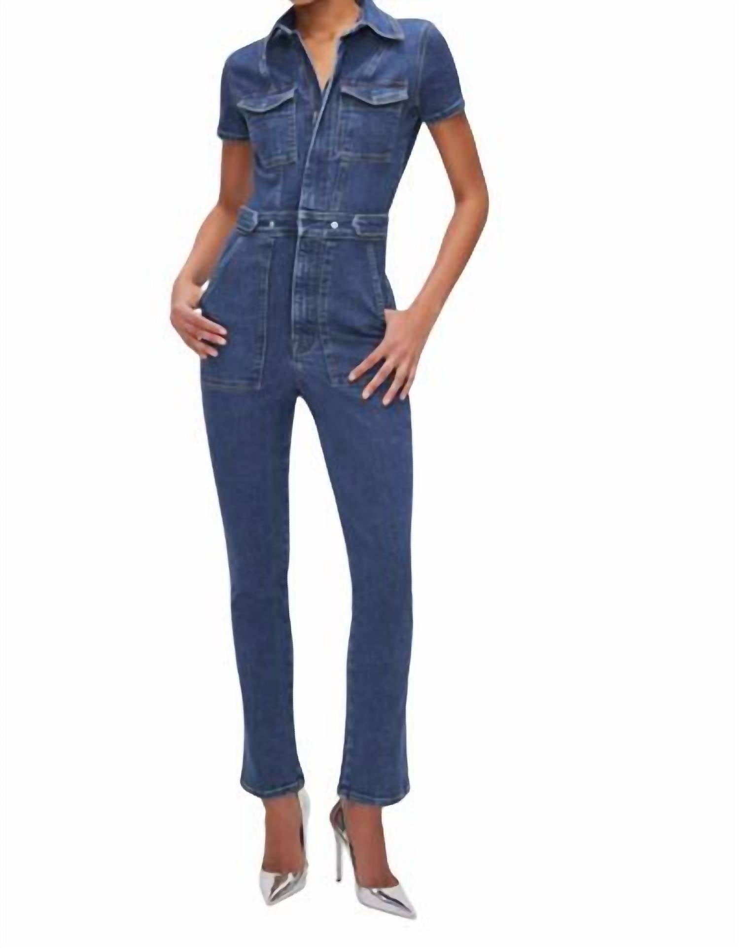 Features a hidden front zipper closure and breast pockets. Collar neckline. Short sleeves. Front zipper closure. Chest, side and back pockets. Snap button closures at the waistline. Straight legs. 81.5% Cotton, 15% Recycled Cotton, 4.5% Elasterl-P, 5% Recycled Polyester, 4% Elastane. Machine wash.