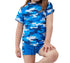 This GIrls Shirt and short set, blue camouflage print, t-shirt with sleeves, short bottom.