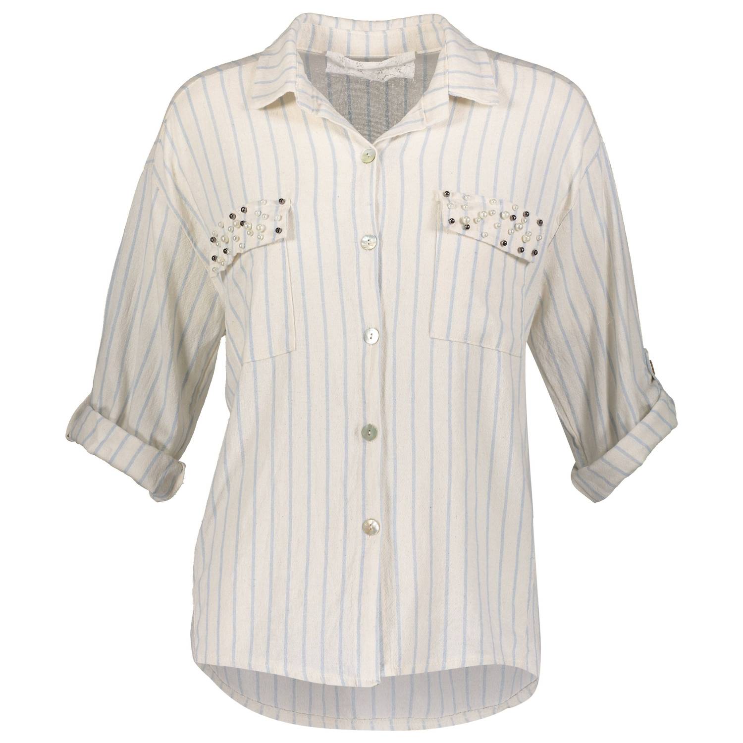 Perfectly tailored and soft to the touch. Perfect for those spring travel plans with its light blue striped pattern. Featuring three-quarter sleeves and a classic collar neckline. Button-down shirt blends elegance and comfort effortlessly. Crafted from 100% cotton. Offers breathability and a soft touch. For care, simply machine wash cold and tumble dry low.
