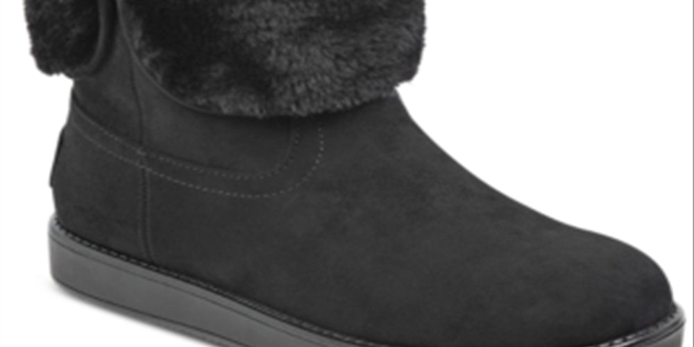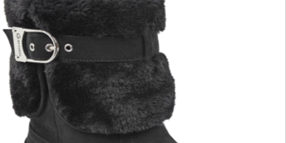 Guess Aussie Cold Weather Boots| A cozy addition to cold-weather style| the Aussie boots from GUESS feature a buckled strap and plush faux fur on a subtle platform for a comfortable boost