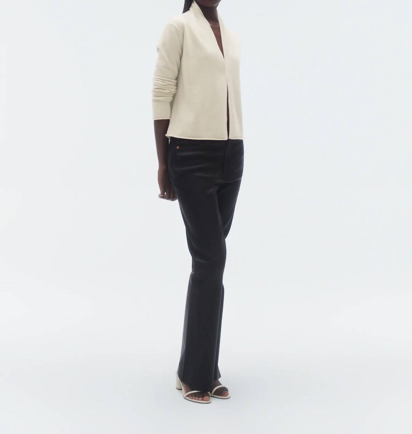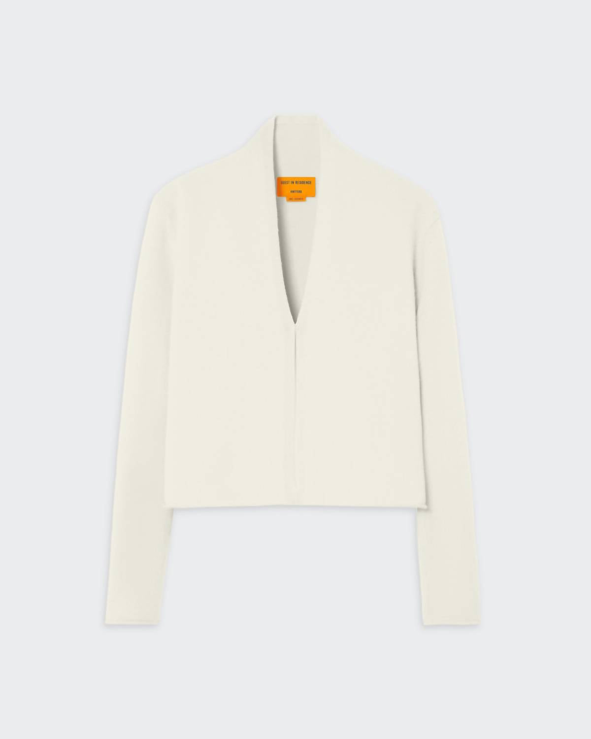 The Stealth V-neck Cardigan by Guest In Residence is a sophisticated layer piece crafted from 100% cashmere sourced from Inner Mongolia. This long sleeve, cream cardigan features an open-front design accentuated with a shawl collar stand and a front hook-and-eye closure. It has a jersey roll at both the hem and sleeve cuffs, with signature GIR branding at the center back, reflecting understated elegance. Manufactured in China, this lightweight knit cardigan is perfect for fall gatherings and travels, and it should be machine washed and laid flat to dry. Model Fatou is 5'8" and wearing a size small.