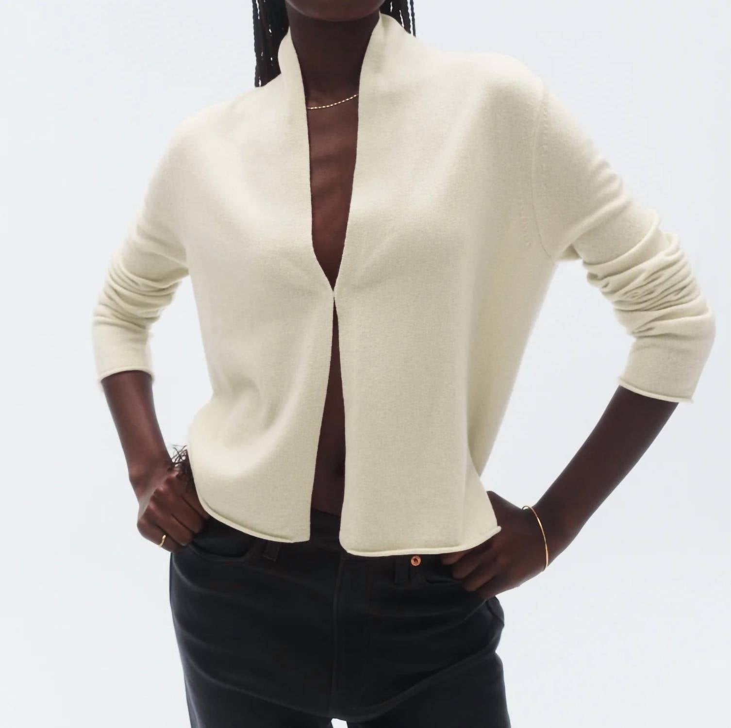 A classic fit that works just as good buttoned as it does left open. The Stealth V-neck Cardigan by Guest In Residence is a sophisticated layer piece crafted from 100% cashmere sourced from Inner Mongolia. This long sleeve, cream cardigan features an open-front design accentuated with a shawl collar stand and a front hook-and-eye closure. It has a jersey roll at both the hem and sleeve cuffs, with signature GIR branding at the center back, reflecting understated elegance. Manufactured in China, this lightweight knit cardigan is perfect for fall gatherings and travels, and it should be machine washed and laid flat to dry. Model Fatou is 5'8" and wearing a size small.