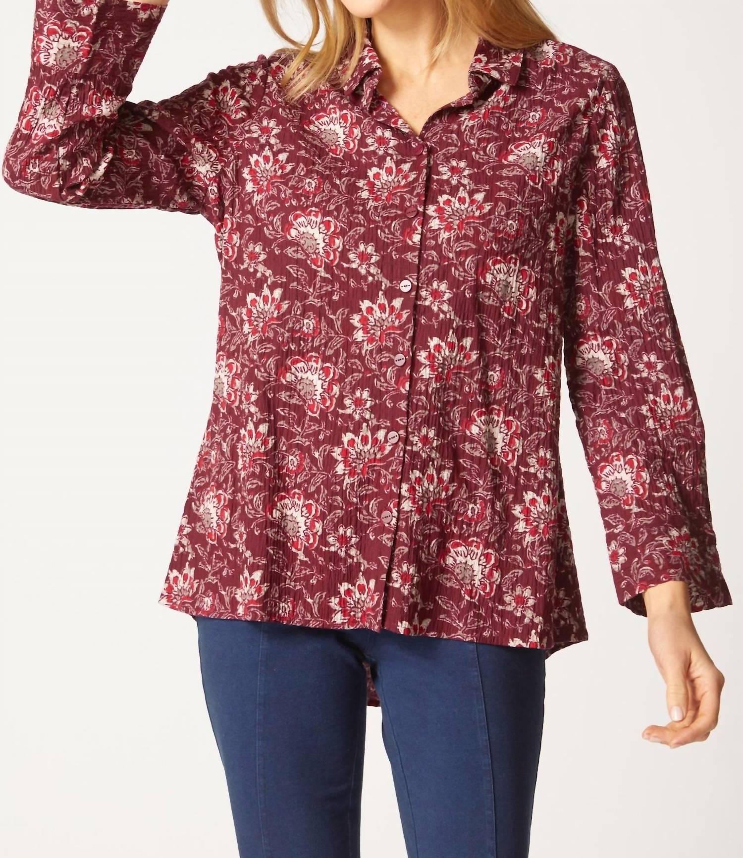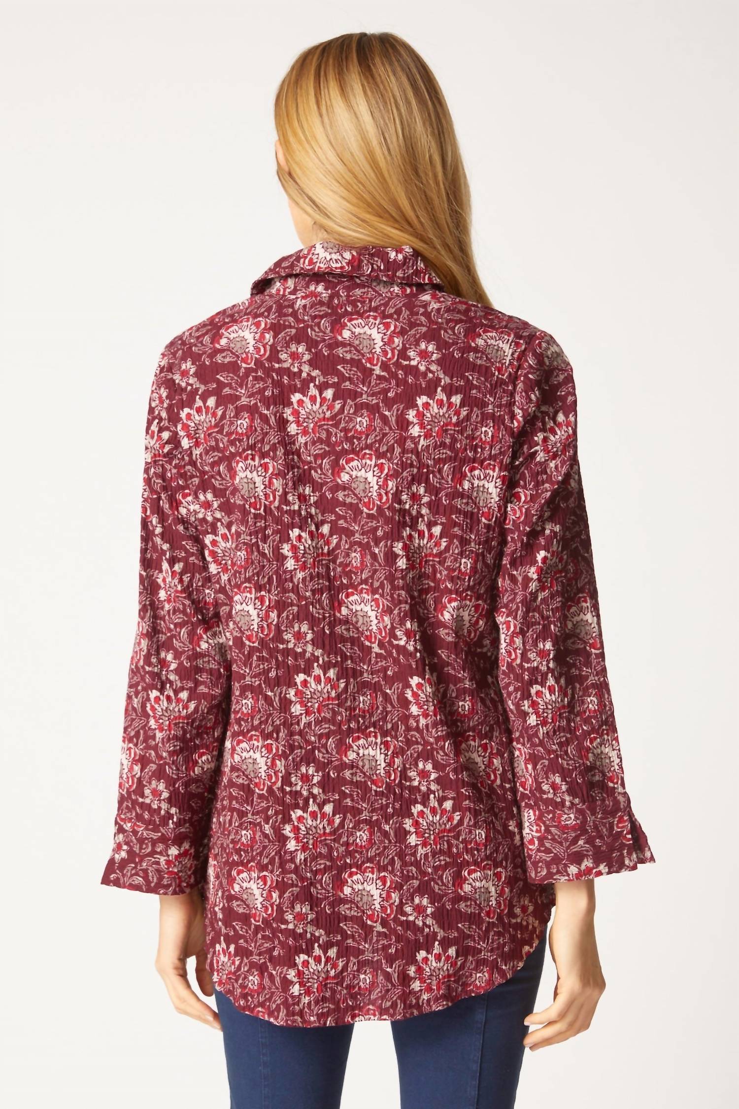 Presenting the Block Print Tailored Shirt by Habitat, a chic wine-hued addition to your wardrobe. This women's shirt boasts long sleeves and an exclusive batik floral print, crafted from a cotton blend of 98% cotton and 2% spandex for a crinkle texture that requires no ironing. Closure: Button closure. Care: Machine wash cold with like colors, tumble dry low, cool iron if necessary. With a front length of 27 inches, two front pockets, and dyed-to-match buttons, this piece offers a relaxed fit ideal for boho chic trends at holiday parties. Model is 5’9” wearing a size small with sleeve length measuring 29.5 inches.