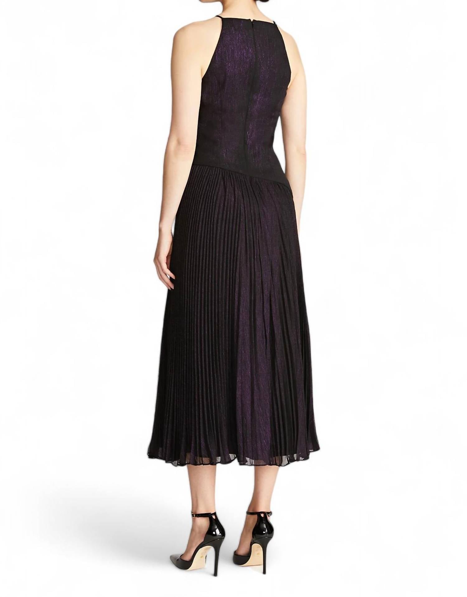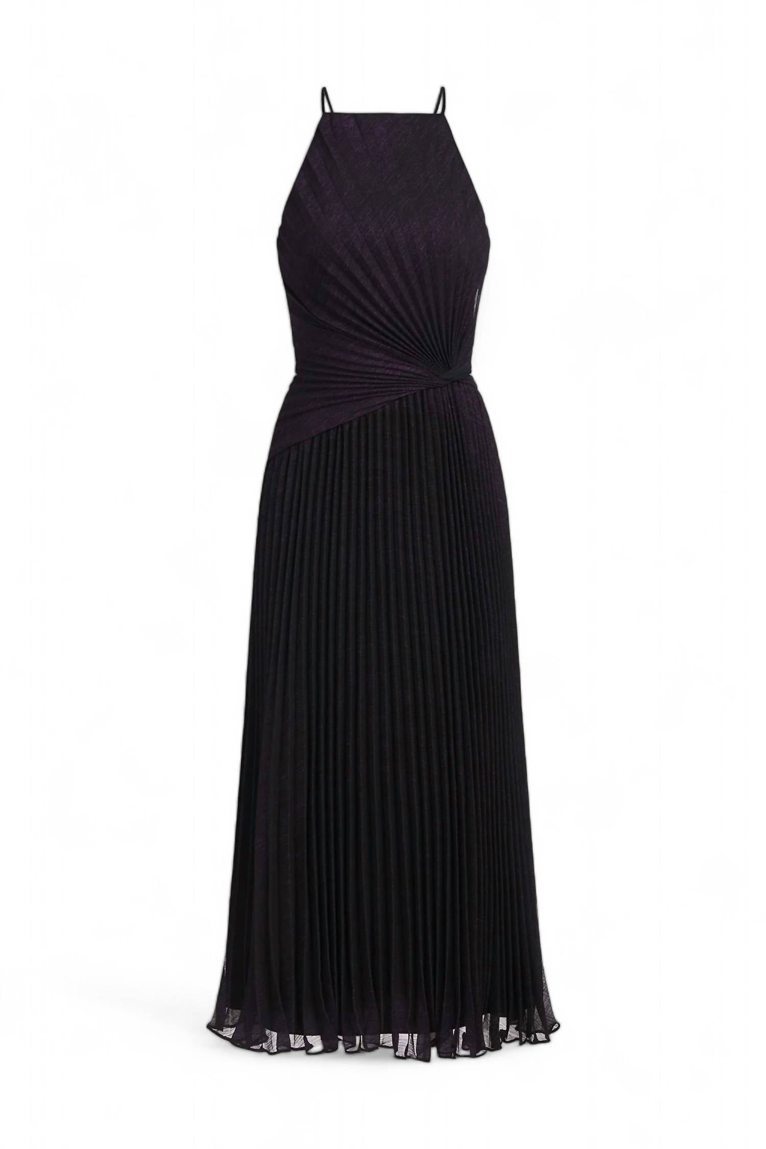 The perfect length dress does exist.This foiled crinkle chiffon dress features a bateau neckline and sunburst pleat detail. It is sleeveless with a fit and flare silhouette, crafted from 100% Polyester fabric that does not stretch. Dry clean only.