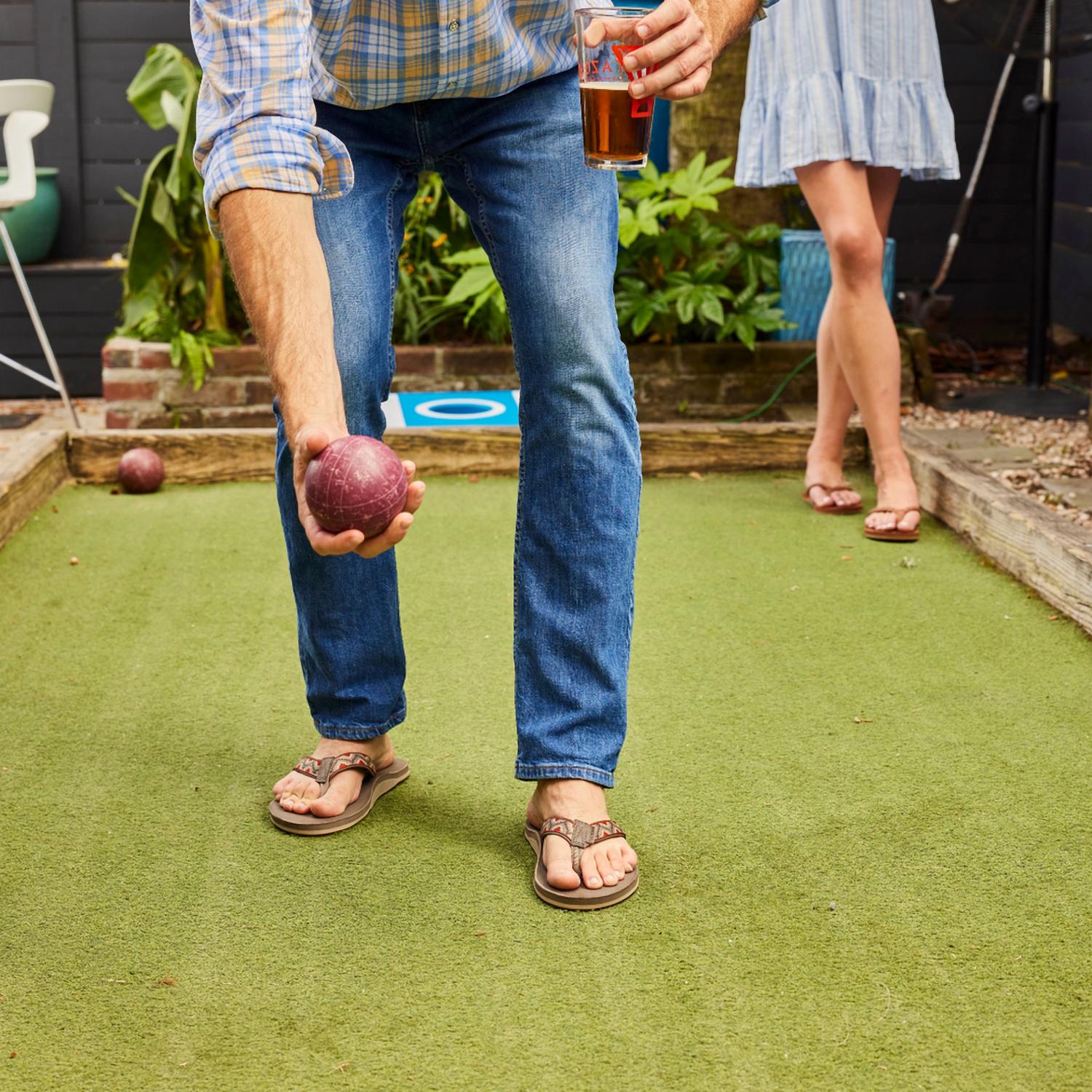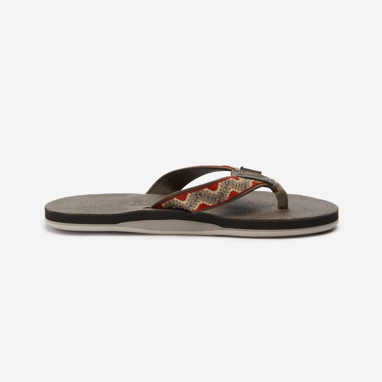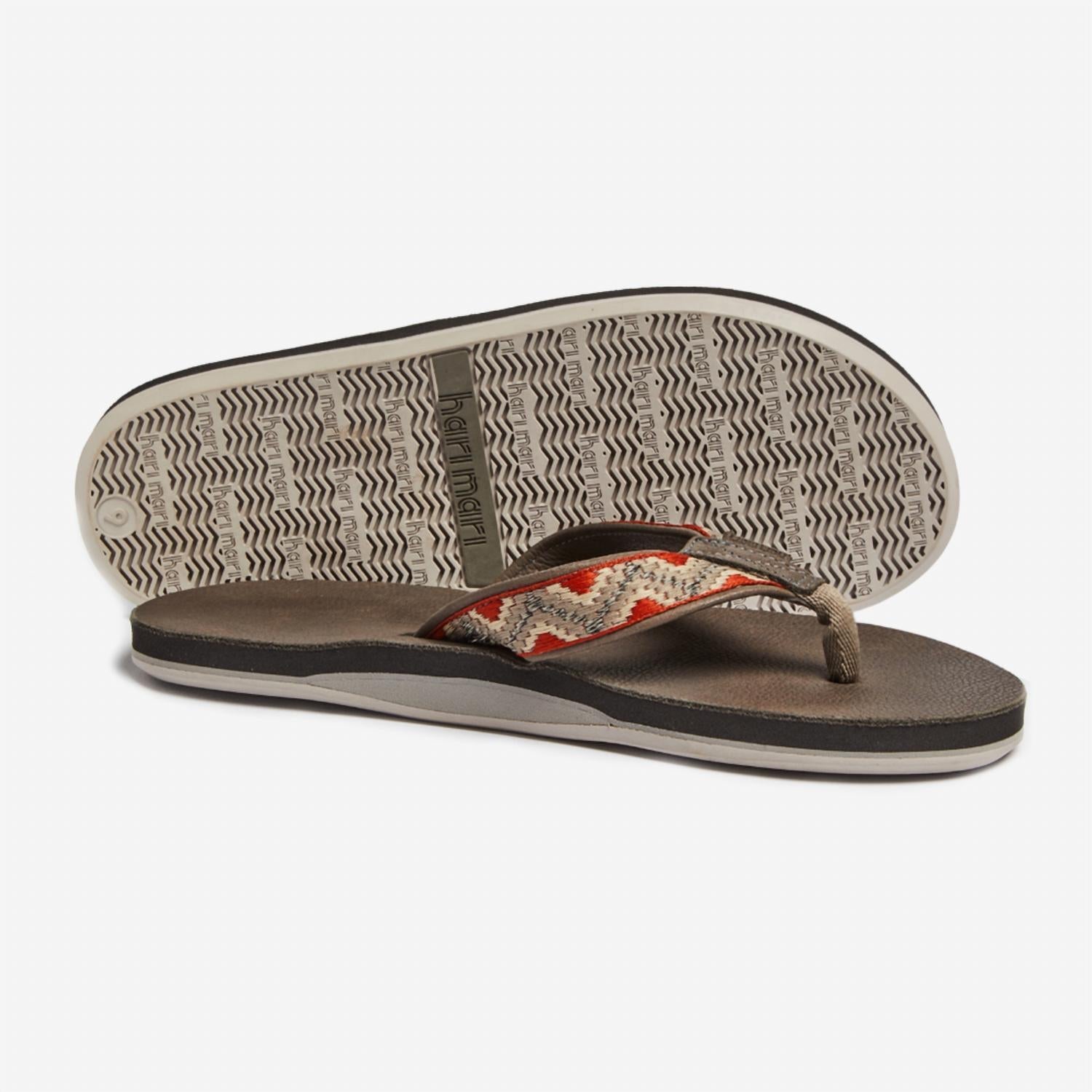 Introducing the Men's Fields Camino Flip Flops by Hari Mari, a perfect blend of style and comfort for your summer adventures. These Ash-colored flip flops feature the patented MemoryFoamToe™ post, ensuring instant comfort without the typical break-in period. Crafted from premium vegetable-tanned leather with striking Southwestern-inspired woven nylon straps and cushy insoles, they offer a firm arch support and a stable cupped heel. Designed with boat-safe molded rubber outsoles for enhanced grip, and custom molded, non-marking soles, these flip flops are long-lasting yet require spot cleaning with a damp rag.